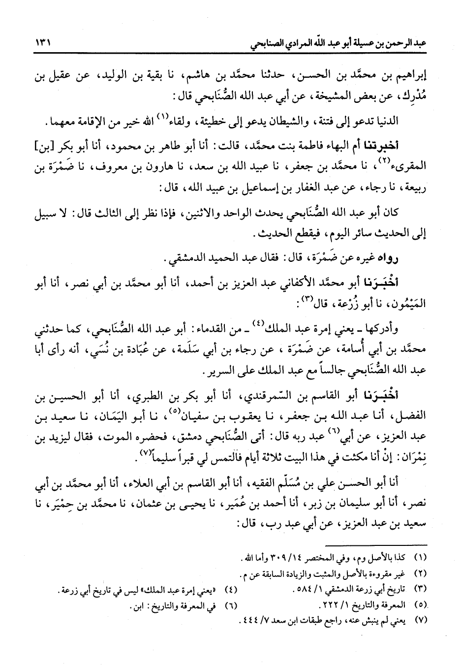 ابراهيم بن محمد بن الحسن حدثنا محمد بن هاشم نا بقية بن الوليد عن عقيل بن مدرك عن بعض المشيخة عن أبي عبد الله الصنابحي قال الدنيا تدعو الى فتنة والشيطان يدعو الى خطيئة ولقاء (1) الله خير من الإقامة معهما أخبرتنا أم البهاء فاطمة بنت محمد قالت أنا أبو طاهر بن محمود أنا أبا بكر بن المقرئ (2) نا محمد بن جعفر نا عبيد الله بن سعد نا هارون بن معروف نا ضمرة بن ربيعة نا رجاء عن عبد الغفار بن اسماعيل بن عبيد الله قال كان أبو عبد الله الصنابحي يحدث الواحد والإثنين فإذا نظر الى الثالث قال لا سبيل الى الحديث سائر اليوم فيقطع الحديث رواه غيره عن ضمرة قال فقال عبد الحميد الدمشقي أخبرنا أبو محمد الأكفاني عبد العزيز احمد أنا أبو محمد بن أبي نصر أنا أبو الميمون نا أبو زرعة قال (3) وأدركها يعني امرة عبد الملك (4) من القدماء أبو عبد الله الصنابحي كما حدثني محمد بن أبي أسامة عن ضمرة عن رجاء بن أبي سلمة عن عبادة بن نسي انه رأى أبا عبد الله الصنابحي جالسا مع عبد الملك على السرير أخبرنا أبو القاسم بن السمرقندي أنا أبو بكر بن الطبري أنا أبو الحسين بن الفضل أنا عبد الله بن جعفر نا يعقوب بن سفيان (5) نا أبو اليمان نا سعيد بن عبد العزيز عن أبي (6) عبدربه قال أتى الصنابحي دمشق فحضره الموت فقال ليزيد بن نمران ان أنا مكثت في هذا البيت ثلاثة أيام فالتمس لي قبرا سليما (7) أنا أبو الحسن علي بن مسلم الفقيه أنا أبو القاسم بن أبي العلاء أنا أبو محمد بن أبي نصر أنا أبو سليمان بن زبر أنا أحمد بن عمير نا يحيى بن عثمان نا محمد بن حمير نا سعيد بن عبد العزيز عن أبي عبد رب قال