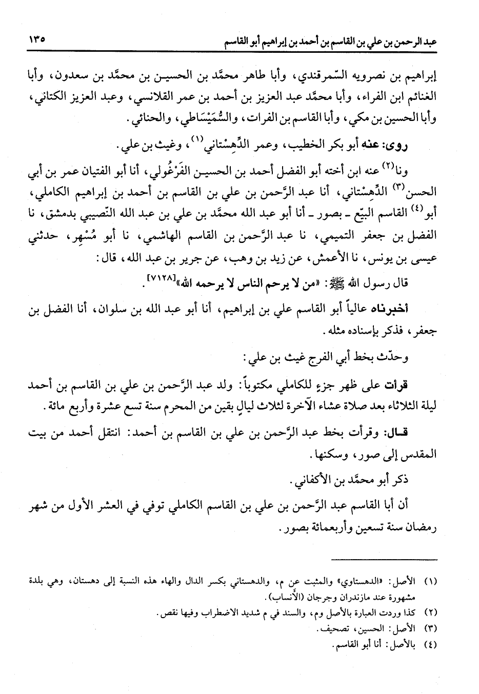 إبراهيم بن نصرويه السمرقندي وأبا طاهر محمد بن الحسين بن محمد بن سعدون وأبا الغنائم ابن الفراء وأبا محمد عبد العزيز بن أحمد بن عمر القلانسي وعبد العزيز الكتاني وأبا الحسين بن مكي وأبا القاسم بن الفرات والسميساطي والحنائي روى عنه أبو بكر الخطيب وعمر الدهستاني (1) وغيث بن علي ونا (2) عنه ابن أخته أبو الفضل احمد بن الحسين الفرغولي أنا أبو الفتيان عمر بن أبي الحسن (3) الدهستاني أنا عبد الرحمن بن علي بن القاسم بن أحمد بن ابراهيم الكاملي أبو (4) القاسم البيع بصور أنا أبو عبد الله محمد بن علي بن عبد الله النصيبي بدمشق نا الفضل بن جعفر التميمي نا عبد الرحمن بن القاسم الهاشمي نا أبو مسهر حدثني عيسى بن يونس نا الأعمش عن زيد بن وهب عن جرير بن عبد الله قال قال رسول الله (صلى الله عليه وسلم) من لا يرحم الناس لا يرحمه الله