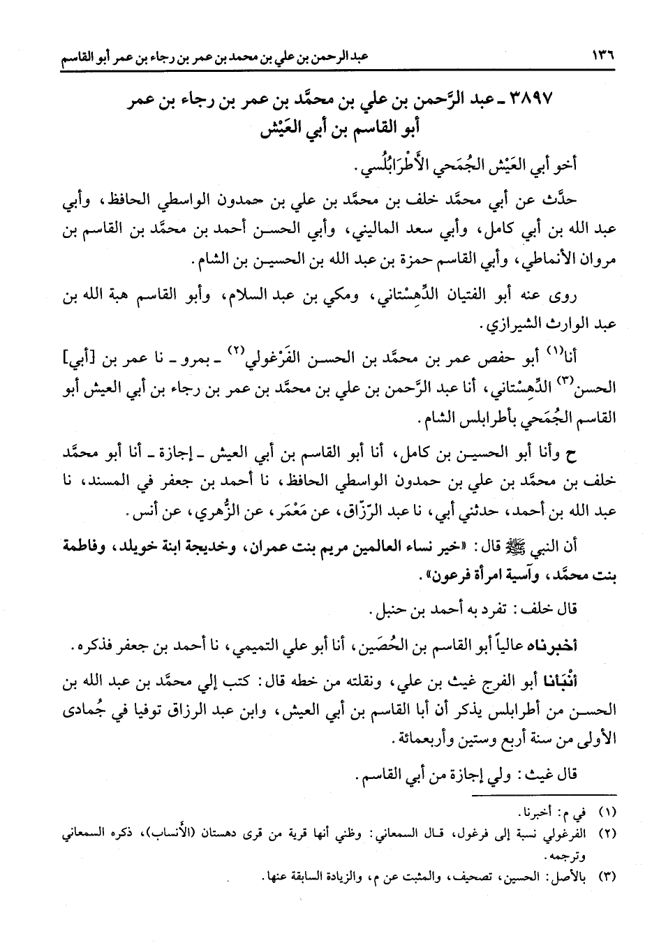 3897 - عبد الرحمن بن علي بن محمد بن عمر بن رجاء بن عمر أبو القاسم بن أبي العيش أخو أبي العيش الجمحي الأطرابلسي حدث عن أبي محمد خلف بن محمد بن علي بن حمدون الواسطي الحافظ وأبي عبد الله بن أبي كامل وأبي سعد الماليني وأبي الحسن أحمد بن محمد بن القاسم بن مروان الأنماطي وأبي القاسم حمزة بن عبد الله بن الحسين بن الشام روى عنه أبو الفتيان الدهستاني ومكي بن عبد السلام وأبو القاسم هبة الله بن عبد الوارث الشيرازي أنا (1) أبو حفص عمر بن محمد بن الحسن الفرغولي (2) بمرو نا عمر بن أبي الحسن (3) الدهستاني أنا عبد الرحمن بن علي بن محمد بن عمر بن رجاء بن أبي العيش أبو القاسم الجمحي بأطرابلس الشام ح وأنا أبو الحسين بن كامل أنا أبو القاسم بن أبي العيش اجازة أنا أبو محمد خلف بن محمد بن علي بن حمدون الواسطي الحافظ نا أحمد بن جعفر في المسند نا عبد الله بن أحمد حدثني أبي نا عبد الرزاق عن معمر عن الزهري عن أنس ان النبي (صلى الله عليه وسلم) قال خير نساء العالمين مريم بنت عمران وخديجة ابنة خويلد وفاطمة بنت محمد وآسية امرأة فرعون قال خلف تفرد به أحمد بن حنبل أخبرناه عاليا أبو القاسم بن الحصين أنا أبو علي التميمي نا أحمد بن جعفر فذكره أنبأنا أبو الفرج غيث بن علي ونقلته من خطه قال كتب إلي محمد بن عبد الله بن الحسن من أطرابلس يذكر ان أبا القاسم بن أبي العيش وابن عبد الرزاق توفيا في جمادى الأولى من سنة أربع وستين وأربعمائة قال غيث ولي اجازة من أبي القاسم