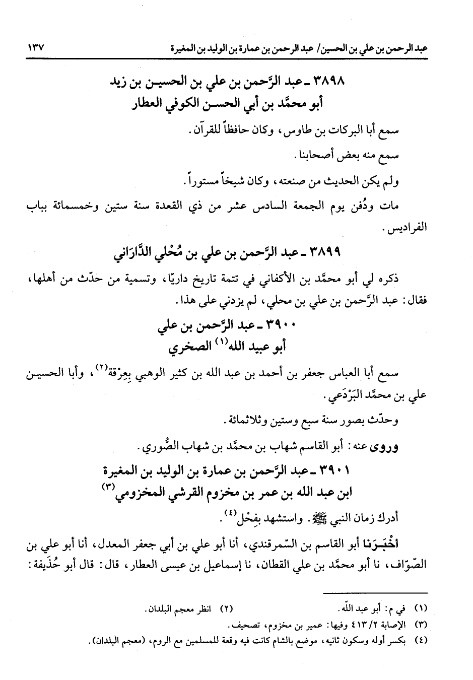 3900 - عبد الرحمن بن علي أبو عبيد الله (1) الصخري سمع أبا العباس جعفر بن أحمد بن عبد الله بن كثير الوهبي بعرقة (2) وأبا الحسين علي بن محمد البردعي وحدث بصور سنة سبع وستين وثلاثمائة وروى عنه أبو القاسم شهاب بن محمد بن شهاب الصوري 3901 - عبد الرحمن بن عمارة بن الوليد بن المغيرة ابن عبد الله بن عمر بن مخزوم القرشي المخزومي (3) أدرك زمان النبي (صلى الله عليه وسلم) واستشهد بفحل (4) أخبرنا أبو القاسم بن السمرقندي أنا أبو علي بن أبي جعفر المعدل أنا أبو علي بن الصواف نا أبو محمد بن علي القطان نا اسماعيل بن عيسى العطار قال قال أبو حذيفة