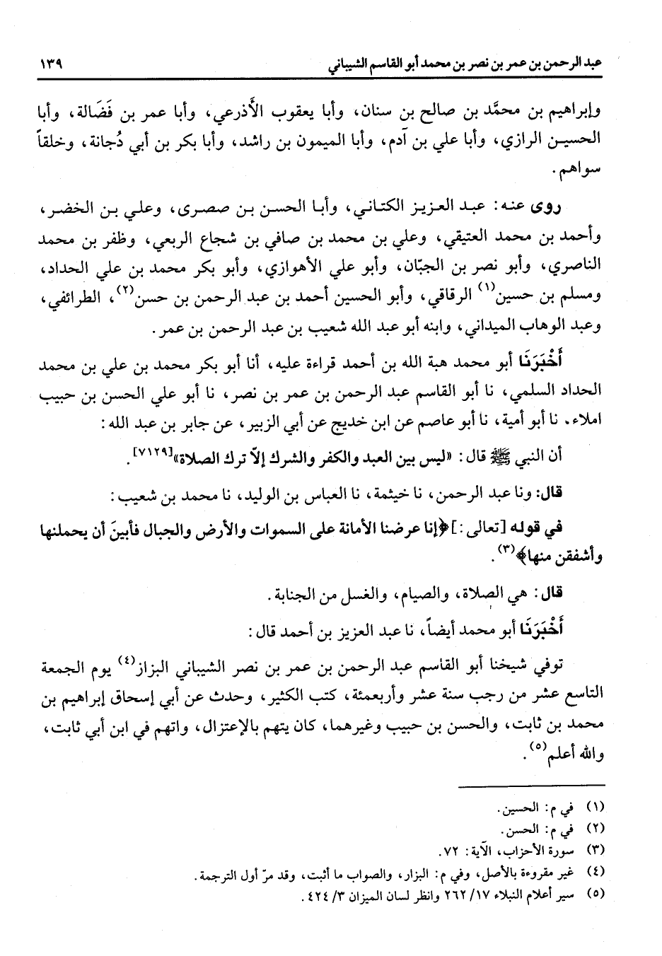 [7129] قال ونا عبد الرحمن نا خيثمة نا العباس بن الوليد نا محمد بن شعيب في قوله تعالى " أنا عرضنا الأمانة على السموات والأرض والجبال فأبين ان يحملنها وأشفقن منها " (3) قال هي الصلاة والصيام والغسل من الجنابة أخبرنا أبو محمد أيضا نا عبد العزيز بن أحمد قال توفي شيخنا أبو القاسم عبد الرحمن بن عمر بن نصر الشيباني البزاز (4) يوم الجمعة التاسع عشر من رجب سنة عشر وأربعمئة كتب الكثير وحدث عن أبي اسحاق ابراهيم بن محمد بن ثابت والحسن بن حبيب وغيرهما كان يتهم بالإعتزال واتهم في ابن ابي ثابت والله أعلم (5)