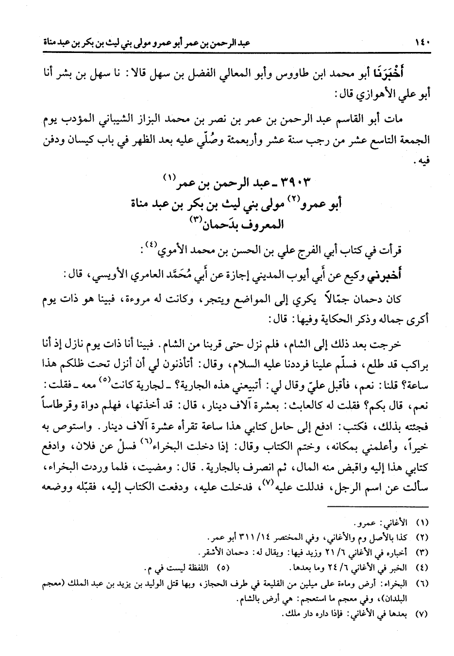 3903 - عبد الرحمن بن عمر (1) أبو عمرو (2) مولى بني ليث بن بكر بن عبد مناة المعروف بدحمان (3) قرأت في كتاب أبي الفرج علي بن الحسن بن محمد الأموي (4) اخبرني وكيع عن أبي أيوب المديني اجازة عن أبي محمد العامري الأويسي قال كان دحمان جمالا يكري الى المواضع ويتجر وكانت له مروءة فبينا هو ذات يوم اكرى جماله وذكر الحكاية وفيها قال خرجت بعد ذلك الى الشام فلم نزل حتى قربنا من الشام فبينا أنا ذات يوم نازل إذا أنا براكب قد طلع فسلم علينا فرددنا عليه السلام وقال أتأذنون لي ان انزل تحت ظلكم هذا ساعة قلنا نعم فأقبل علي وقال أتبيعني هذه الجارية لجارية كانت (5) معه فقلت نعم قال بكم فقلت له كالعابث بعشرة آلاف دينار قال قد أخذتها فهلم دواة وقرطاسا فجئته بذلك فكتب ادفع الى حامل كتابي هذا ساعة تقرأه عشرة آلاف دينار واستوص به