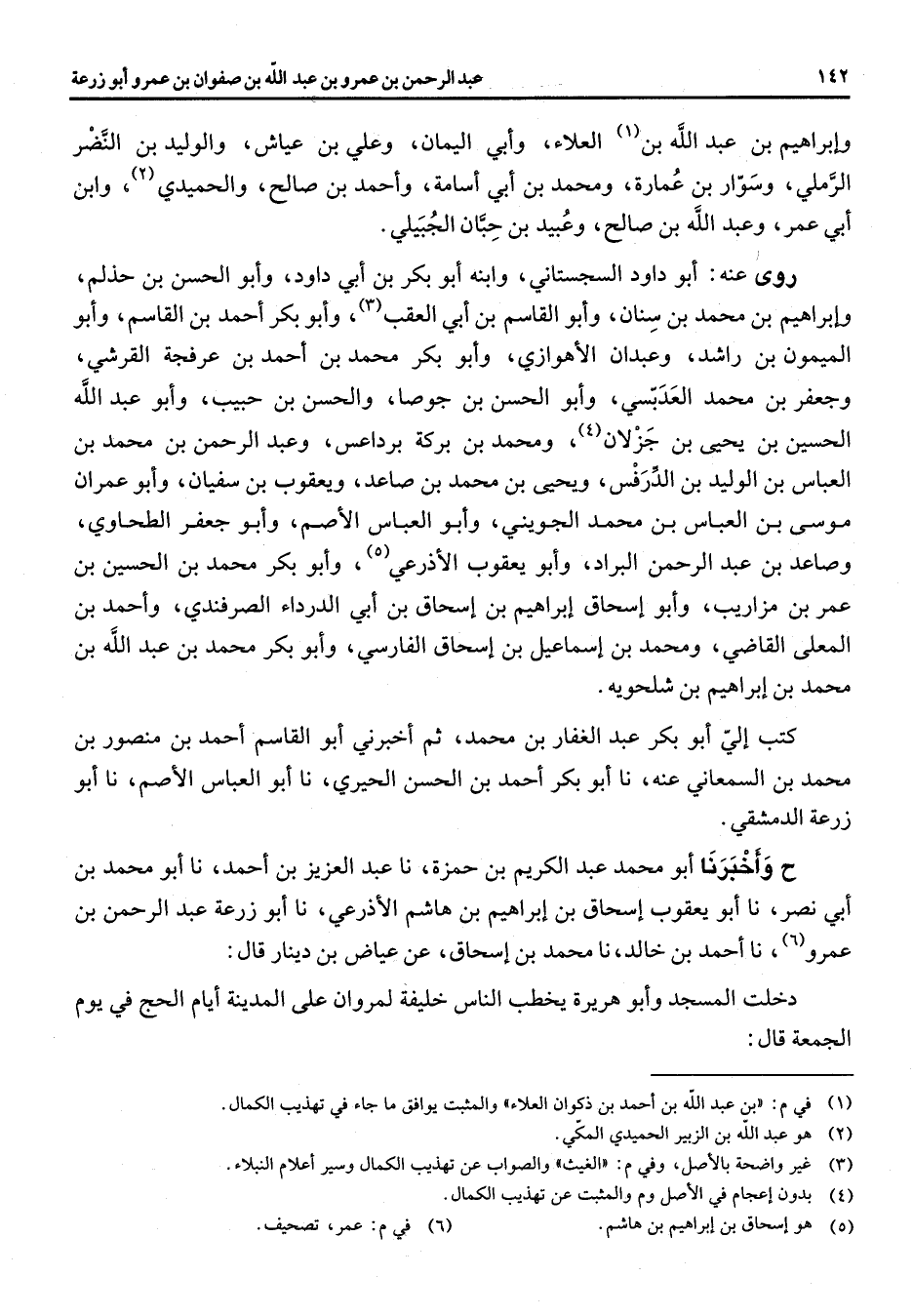 وابراهيم بن عبد الله (1) بن العلاء وأبي اليمان وعلي بن عياش والوليد بن النضر الرملي وسوار بن عمارة ومحمد بن أبي أسامة وأحمد بن صالح والحميدي (2) وابن أبي عمر وعبد الله بن صالح وعبيد بن حيان الجبيلي روى عنه أبو داود السجستاني وابنه أبو بكر بن أبي داود وأبو الحسن بن حذلم وابراهيم بن محمد بن سنان وأبو القاسم بن أبي العقب (3) وأبو بكر أحمد بن القاسم وأبو الميمون بن راشد وعبدان الأهوازي وأبو بكر محمد بن أحمد بن عرفجة القرشي وجعفر بن محمد العدبسي وابو الحسن بو جوصا والحسن بن حبيب وابو عبد الله الحسين بن يحيى بن جزلان (4) ومحمد بن بركة برداعس وعبد الرحمن بن محمد بن العباس بن الوليد بن الدرفس ويحيى بن محمد بن صاعد ويعقوب بن سفيان وابو عمران موسى بن العباس بن محمد الجويني وأبو العباس الأصم وأبو جعفر الطحاوي وصاعد بن عبد الرحمن البراد وأبو يعقوب الأذرعي (5) وأبو بكر محمد بن الحسين بن عمر بن مزاريب وأبو اسحاق ابراهيم بن اسحاق بن أبي الدرداء الصرفندي واحمد بن المعلى القاضى ومحمد بن اسماعيل بن اسحاق الفارسي وأبو بكر محمد بن عبد الله بن محمد بن ابراهيم بن شلحويه كتب الي أبو بكر عبد الغفار بن محمد ثم أخبرني أبو القاسم أحمد بن منصور بن محمد بن السمعاني عنه نا أبو بكر بن الحسن الحيري نا أبو العباس الأصم نا أبو زرعة الدمشقي ح وأخبرنا أبو محمد عبد الكريم بن حمزة نا عبد العزيز بن احمد نا أبو محمد بن أبي نصر نا أبو يعقوب اسحاق بن ابراهيم بن هاشم الأذرعي نا أبو زرعة عبد الرحمن بن عمرو (6) نا احمد بن خالد نا محمد بن اسحاق عن عياض بن دينار قال دخلت المسجد وابو هريرة يخطب الناس خليفة لمروان على المدينة أيام الحج في يوم الجمعة قال