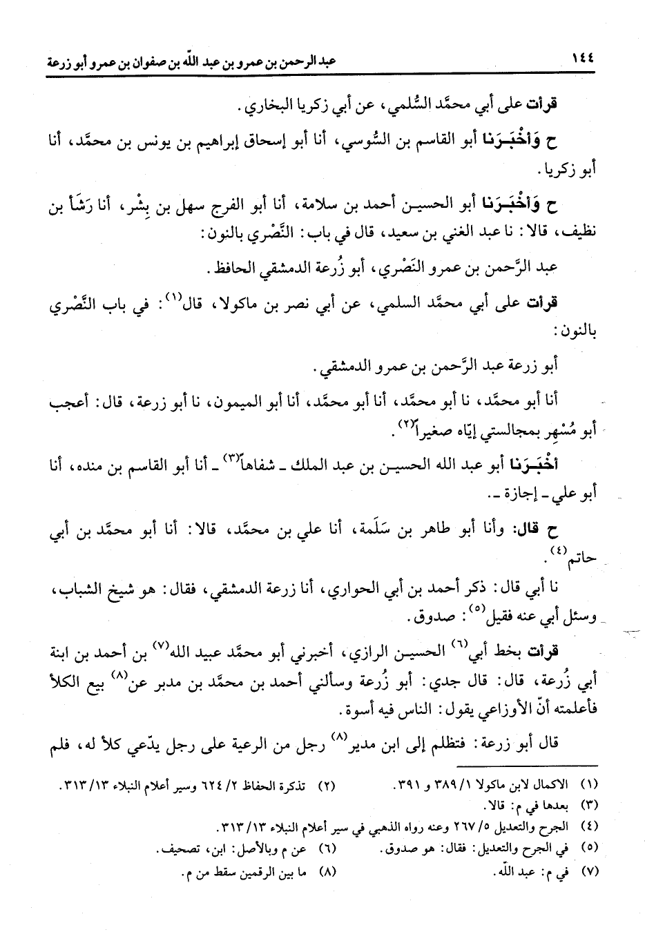 قرأت على أبي محمد السلمي عن أبي زكريا البخاري ح وأخبرنا أبو القاسم بن السوسي أنا أبو اسحاق ابراهيم بن بن يونس بن محمد أنا أبو زكريا ح وأخبرنا أبو الحسين احمد بن سلامة أنا أبو الفرج سهل بن بشر أنا رشأ بن نظيف قالا نا عبد الغني بن سعيد قال في باب النصري بالنون عبد الرحمن بن عمرو النصري أبو زرعة الدمشقي الحافظ قرأت على أبي محمد السلمي عن أبي نصر بن ماكولا قال (1) في باب النصري بالنون أبو زرعة عبد الرحمن بن عمرو الدمشقي أنا أبو محمد نا أبو محمد أنا أبو محمد أنا أبو الميمون نا أبو زرعة قال أعجب أبو مسهر بمجالستي اياه صغيرا (2) أخبرنا أبو عبد الله الحسين بن عبد الملك شفاها (3) أنا أبو القاسم بن منده أنا أبو علي اجازة ح قال وأنا أبو طاهر بن سلمة أنا علي بن محمد قالا أنا أبو محمد بن أبي حاتم (4) نا أبي قال ذكر احمد بن أبي الحواري أنا زرعة الدمشقي فقال هو شيخ الشباب وسئل أبي عنه فقيل (5) صدوق قرأت بخط أبي (6) الحسين الرازي أخبرني أبو محمد عبيد الله (7) بن أحمد بن ابنة أبي زرعة قال قال جدي أبو زرعة وسألني أحمد بن محمد بن مدبر عن (8) بيع الكلأ فأعلمته ان الأوزاعي يقول الناس فيه أسوة قال أبو زرعة فتظلم الى ابن مدير (8) رجل من الرعية على رجل يدعي كلأ له فلم