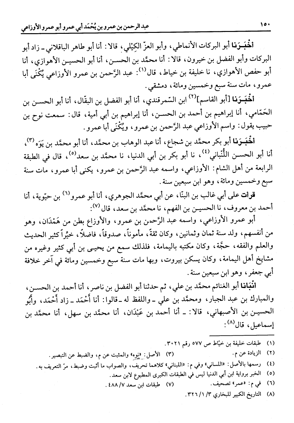 اخبرنا أبو البركات الأنماطي وأبو العز الكيلي قالا أنا أبو طاهر الباقلاني زاد أبو البركات وأبو الفضل بن خيرون قالا أنا محمد بن الحسن أنا أبو الحسين الأهوازي أنا أبو حفص الأهوازي نا خليفة بن خياط قال (1) عبد الرحمن بن عمرو الأوزاعي يكنى أبا عمرو مات سنة سبع وخمسين ومائة دمشقي أخبرنا [أبو القاسم] (2) ابن السمرقندي أنا أبو الفضل بن البقال أنا أبو الحسن بن الحمامي أنا ابراهيم بن أحمد بن الحسن أنا ابراهيم بن أبي امية قال سمعت نوح بن حبيب يقول واسم الأوزاعي عبد الرحمن بن عمرو ويكنى أبا عمرو أخبرنا أبو بكر محمد بن شجاع أنا عبد الوهاب بن محمد أنا أبو محمد بن يوة (3) أنا أبو الحسن اللنباني (4) نا أبو بكر بن أبي الدنيا نا محمد بن سعد (5) قال في الطبقة الرابعة من أهل الشام الأوزاعي واسمه عبد الرحمن بن عمرو يكنى أبا عمرو مات سنة سبع وخمسين ومائة وهو ابن سبعين سنة قرأت على ابي غالب بن البنا عن أبي محمد الجوهري أنا أبو عمرو (6) بن حيوية أنا احمد بن معروف نا الحسين بن الفهم نا محمد بن سعد قال (7) أبو عمرو الأوزاعي واسمه عبد الرحمن بن عمرو والأوزاع بطن من همدان وهو من انفسهم ولد سنة ثمان وثمانين وكان ثقة مأمونا صدوقا فاضلا خيرا كثير الحديث والعلم والفقه حجة وكان مكتبه باليمامة فلذلك سمع من يحيى بن أبي كثير وغيره من مشايخ اهل اليمامة وكان يسكن بيروت وبها مات سنة سبع وخمسين ومائة في آخر خلافة أبي جعفر وهو ابن سبعين سنة أنبأنا أبو الغنائم محمد بن علي ثم حدثنا أبو الفضل بن ناصر أنا أحمد بن الحسن والمبارك بن عبد الجبار ومحمد بن علي واللفظ له قالوا أنا أحمد زاد أحمد وأبو الحسين بن الأصبهاني قالا أنا أحمد بن عبدان أنا محمد بن سهل أنا محمد بن اسماعيل قال (8)