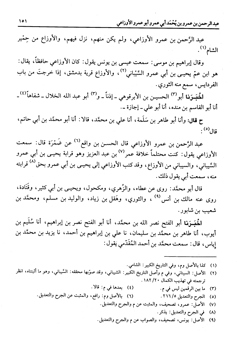 عبد الرحمن بن عمرو الأوزاعي ولم يكن منهم نزل فيهم والأوزاع من حمير الشام (1) وقال ابراهيم بن موسى سمعت عيسى بن يونس يقول كان الأوزاعي حافظا يقال هو ابن عم يحيى بن أبي عمرو السيباني (2) والأوزاع قرية بدمشق إذا خرجت من باب الفردايس سمع منه الثوري أخبرنا (3) أبو الحسين بن الأبرقوهي اذنا و (3) أبو عبد الله الخلال شفاها (4) أنا أبو القاسم بن منده أنا أبو علي اجازة ح قال وأنا أبو طاهر بن سلمة أنا علي بن محمد قالا أنا أبو محمد بن أبي حاتم قال (5) عبد الرحمن بن عمرو الأوزاعي قال الحسن بن واقع (6) عن ضمرة قال سمعت الأوزاعي يقول كنت محتلما خلافة (7) عمر بن عبد العزيز وهو قرابة يحيى بن أبي عمرو السيباني والسيباني من الأوزاع وقد كتب الأوزاعي الى يحيى بن أبي عمرو بحق (8) قرابته منه سمعت أبي يقول ذلك قال أبو محمد روى عن عطاء والزهري ومكحول ويحيى بن أبي كثير وقتادة روى عنه مالك بن أنس (9) والثوري وهقل بن زياد والوليد بن مسلم ومحمد بن شعيب بن شابور أخبرنا أبو الفتح نصر الله بن محمد أنا أبو الفتح نصر بن ابراهيم أنا سليم بن أيوب أنا طاهر بن محمد بن سليمان نا علي بن ابراهيم بن أحمد نا يزيد بن محمد بن اياس قال سمعت محمد بن احمد المقدمي يقول