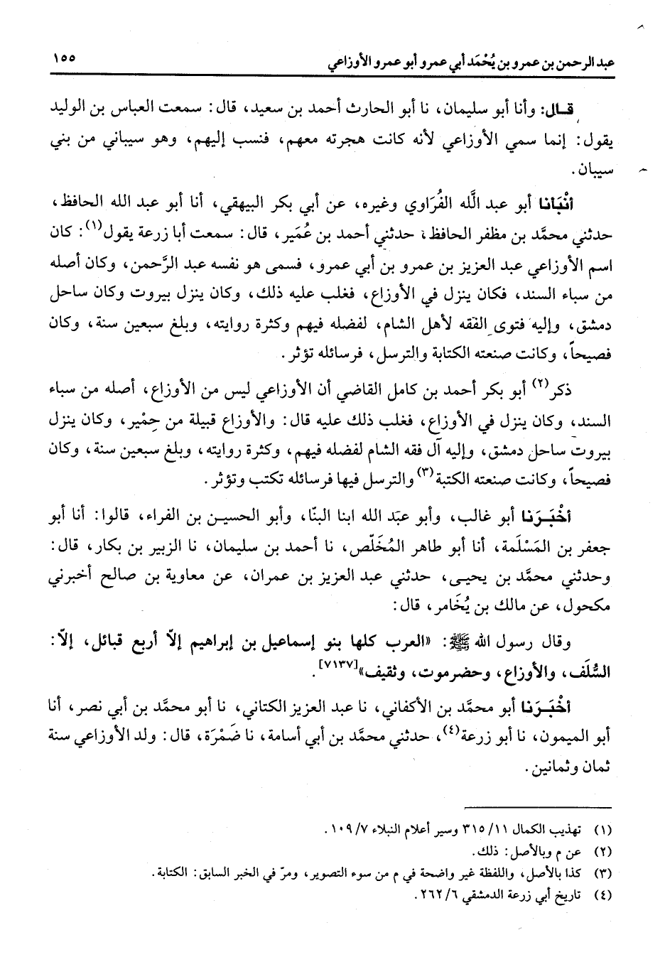 قال وأنا أبو سليمان نا أبو الحارث أحمد بن سعيد قال سمعت العباس بن الوليد يقول انما سمي الأوزاعي لأنه كانت هجرته معهم فنسب إليهم وهو سيباني من بني سيبان أنبأنا أبو عبد الله الفراوي وغيره عن أبي بكر البيهقي أنا أبو عبد الله الحافظ حدثني محمد بن مظفر الحافظ حدثني أحمد بن عمير قال سمعت أبا زرعة يقول (1) كان اسم الأوزاعي عبد العزيز بن عمرو بن أبي عمرو فسمى هو نفسه عبد الرحمن وكان أصله من سباء السند فكان ينزل في الأوزاع فغلب عليه ذلك وكان ينزل بيروت وكان ساحل دمشق واليه فتوى لأهل الشام لفضله فيهم وكثرة روايته وبلغ سبعين سنة وكان فصيحا وكانت صنعته الكتابة والترسل فرسائله تؤثر ذكر (2) أبو بكر أحمد بن كامل القاضي ان الأوزاعي ليس من الأوزاع أصله من سباء السند وكان ينزل في الأوزاع فغلب ذلك عليه قال والأوزاع قبيلة من حمير وكان ينزل بيروت ساحل دمشق واليه آل فقه الشام لفضله فيهم وكثرة روايته وبلغ سبعين سنة وكان فصيحا وكانت صنعته الكتبة (3) والترسل فيها فرسائله تكتب وتؤثر أخبرنا أبو غالب وأبو عبد الله ابنا البنا وأبو الحسين بن الفراء قالوا أنا أبو جعفر بن المسلمة أنا أبو طاهر المخلص نا أحمد بن سليمان نا الزبير بن بكار قال وحدثني محمد بن يحيى حدثني عبد العزيز بن عمران عن معاوية بن صالح أخبرني مكحول عن مالك بن يخامر قال وقال رسول الله (صلى الله عليه وسلم) العرب كلها بنو اسماعيل بن ابراهيم الا أربع قبائل الا السلف والأوزاع وحضرموت وثقيف