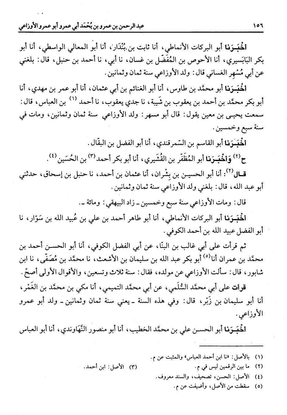 أخبرنا أبو البركات الأنماطي انا ثابت بن بندار انا أبو المعالي الواسطي أنا أبو بكر البابسيري انا الأحوص بن المفضل بن غسان نا أبي نا أحمد بن حنبل قال بلغني عن أبي مسهر الغساني قال ولد الأوزاعي سنة ثمان وثمانين أخبرنا أبو محمد بن طاوس انا أبو الغنائم بن أبي عثمان انا أبو عمر بن مهدي انا أبو بكر محمد بن أحمد بن يعقوب بن شيبة نا جدي يعقوب نا أحمد (1) بن العباس قال سمعت يحيى بن معين يقول قال أبو مسهر ولد الأوزاعي سنة ثمان وثمانين ومات في سنة سبع وخمسين أخبرنا أبو القاسم بن السمرقندي انا أبو الفضل بن البقال ح (2) وأخبرنا أبو المظفر بن القشيري أنا أبو بكر أحمد (3) بن الحسين (4) قال (2) انا أبو الحسين بن بشران انا عثمان بن أحمد نا حنبل بن اسحاق حدثني أبو عبد الله قال بلغني ولد الأوزاعي سنة ثمان وثمانين قال ومات الأوزاعي سنة سبع وخمسين زاد البيهقي ومائة أخبرنا أبو البركات الأنماطي انا أبو طاهر أحمد بن علي بن عبد الله بن سوار نا أبو الفضل عبيد الله بن أحمد الكوفي ثم قرأت على أبي غالب بن البنا عن أبي الفضل الكوفي انا أبو الحسن أحمد بن محمد بن عمران أنا (5) أبو بكر عبد الله بن سليمان بن الأشعث نا محمد بن مصفى نا ابن شابور قال سألت الأوزاعي عن مولده فقال سنة ثلاث وتسعين والأقوال الأولى أصح قرأت على أبي محمد السلمي عن أبي محمد التميمي انا مكي بن محمد بن الغمر انا أبو سليمان بن زبر قال وفي هذه السنة يعني سنة ثمان وثمانين ولد أبو عمرو الأوزاعي أخبرنا أبو الحسن علي بن محمد الخطيب انا أبو منصور النهاوندي أنا أبو العباس