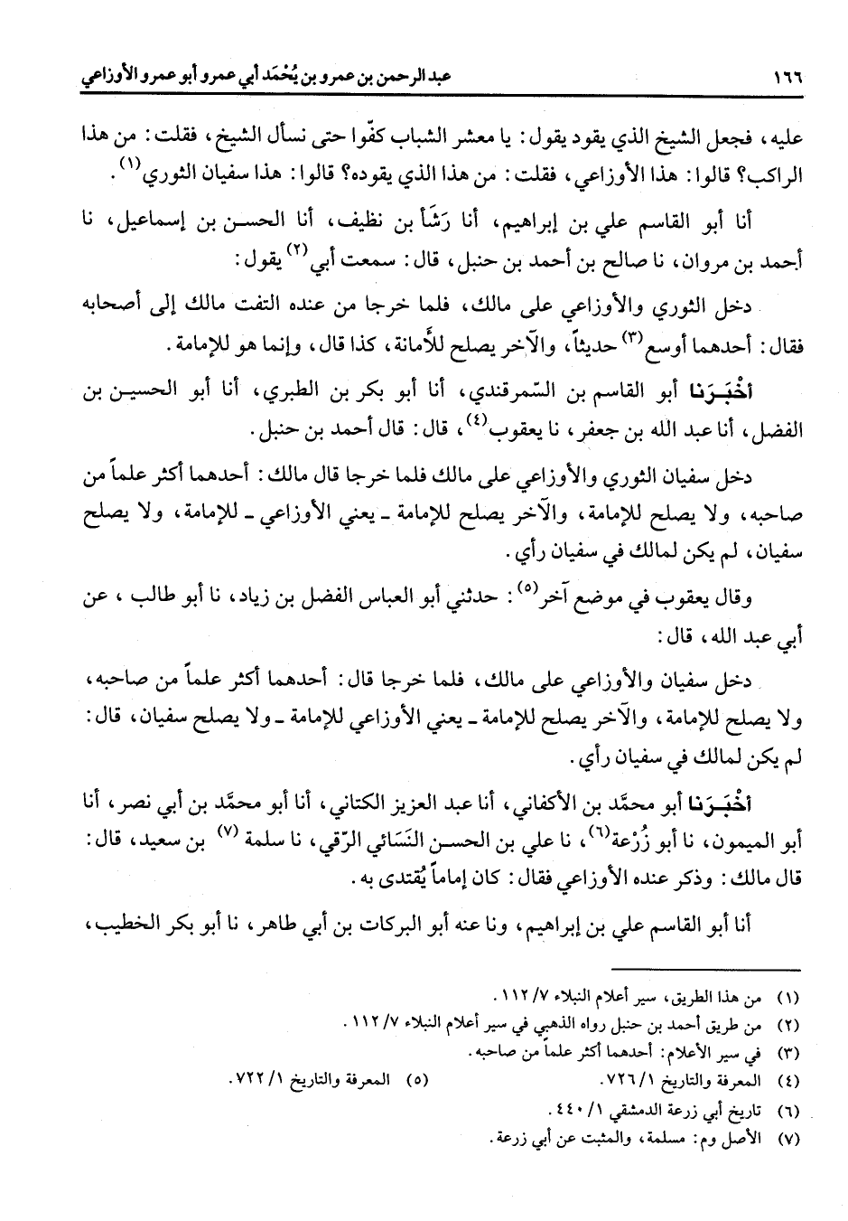 عليه فجعل الشيخ الذي يقود يقول يا معشر الشباب كفوا حتى نسأل الشيخ فقلت من هذا الراكب قالوا هذا الأوزاعي فقلت من هذا الذي يقوده قالوا هذا سفيان الثوري (1) انا أبو القاسم علي بن ابراهيم انا رشأ بن نظيف انا الحسن بن اسماعيل نا أحمد بن مروان نا صالح بن أحمد بن حنبل قال سمعت أبي (2) يقول دخل الثوري والأوزاعي على مالك فلما خرجا من عنده التفت مالك الى أصحابه فقال أحدهما (3) أوسع حديثا والآخر يصلح للأمانة كذا قال وانما هو للإمامة أخبرنا أبو القاسم بن السمرقندي انا أبو بكر بن الطبري انا أبو الحسين بن الفضل انا عبد الله بن جعفر نا يعقوب (4) قال قال أحمد بن حنبل دخل سفيان الثوري والأوزاعي على مالك فلما خرجا قال مالك أحدهما أكثر علما من صاحبه ولا يصلح للإمامة والآخر يصلح للإمامة يعني الأوزاعي للإمامة ولا يصلح سفيان لم يكن لمالك في سفيان رأي وقال يعقوب في موضع آخر (5) حدثني أبو العباس الفضل بن زياد نا أبو طالب عن أبي عبد الله قال دخل سفيان والأوزاعي على مالك فلما خرجا قال أحدهما أكثر علما من صاحبه ولا يصلح للإمامة والآخر يصلح للإمامة يعني الأوزاعي للإمامة ولا يصلح سفيان قال لم يكن لمالك في سفيان رأي أخبرنا أبو محمد بن الأكفاني انا عبد العزيز الكتاني انا أبو محمد بن أبي نصر انا أبو الميمون نا أبو زرعة (6) نا علي بن الحسن النسائي الرقي نا سلمة (7) بن سعيد قال قال مالك وذكر عنده الأوزاعي فقال كان اماما يقتدى به أنا أبو القاسم علي بن ابراهيم ونا عنه أبو البركات بن أبي طاهر نا أبو بكر الخطيب