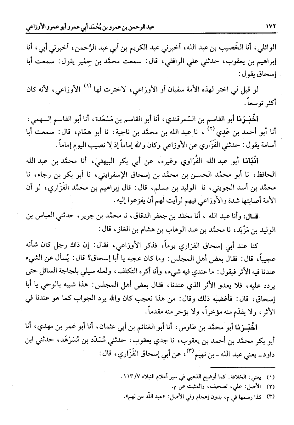 الوائلي انا الخصيب بن عبد الله أخبرني عبد الكريم بن ابي عبد الرحمن أخبرني أبي انا ابراهيم بن يعقوب حدثني علي الرافقي قال سمعت محمد بن حمير يقول سمعت أبا اسحاق يقول لو قيل لي اختر لهذه الأمة سفيان أو الأوزاعي لاخترت لها (1) الأوزاعي لأنه كان اكثر توسعا أخبرنا أبو القاسم بن السمرقندي انا أبو القاسم بن مسعدة انا أبو القاسم السهمي انا أبو أحمد بن عدي (2) نا عبد الله بن محمد بن ناجية نا أبو همام قال سمعت أبا أسامة يقول حدثني الفزاري عن الأوزاعي وكان والله اماما إذ لا نصيب اليوم اماما أنبأنا أبو عبد الله الفراوي وغيره عن أبي بكر البيهقي انا محمد بن عبد الله الحافظ نا أبو محمد الحسن بن محمد بن اسحاق الإسفرايني نا أبو بكر بن رجاء نا محمد بن أسد الجويني نا الوليد بن مسلم قال قال ابراهيم بن محمد الفزاري لو أن الأمة أصابتها شدة والأوزاعي فيهم لرأيت لهم أن يفزعوا إليه قال وانا عبد الله انا مخلد بن جعفر الدقاق نا محمد بن جرير حدثني العباس بن الوليد بن مزيد نا محمد بن عبد الوهاب بن هشام بن الغاز قال كنا عند أبي اسحاق الفزاري يوما فذكر الأوزاعي فقال ان ذاك رجل كان شأنه عجيبا قال فقال بعض اهل المجلس وما كان عجبه يا أبا اسحاق قال يسأل عن الشئ عندنا فيه الأثر فيقول ما عندي فيه شئ وانا أكره التكلف ولعله سيلي بلجاجة السائل حتى يردد عليه فلا يعدو الأثر الذي عندنا فقال بعض اهل المجلس هذا شبيه بالوحي يا أبا اسحاق قال فأغضبه ذلك وقال من هذا نعجب كان والله يرد الجواب كما هو عندنا في الأثر ولا يقدم منه مؤخرا ولا يؤخر منه مقدما أخبرنا أبو محمد بن طاوس انا أبو الغنائم بن أبي عثمان انا أبو عمر بن مهدي انا أبو بكر محمد بن أحمد بن يعقوب نا جدي يعقوب حدثني مسدد بن مسرهد حدثني ابن داود يعني عبد الله بن نهيم (3) عن أبي اسحاق الفزاري قال