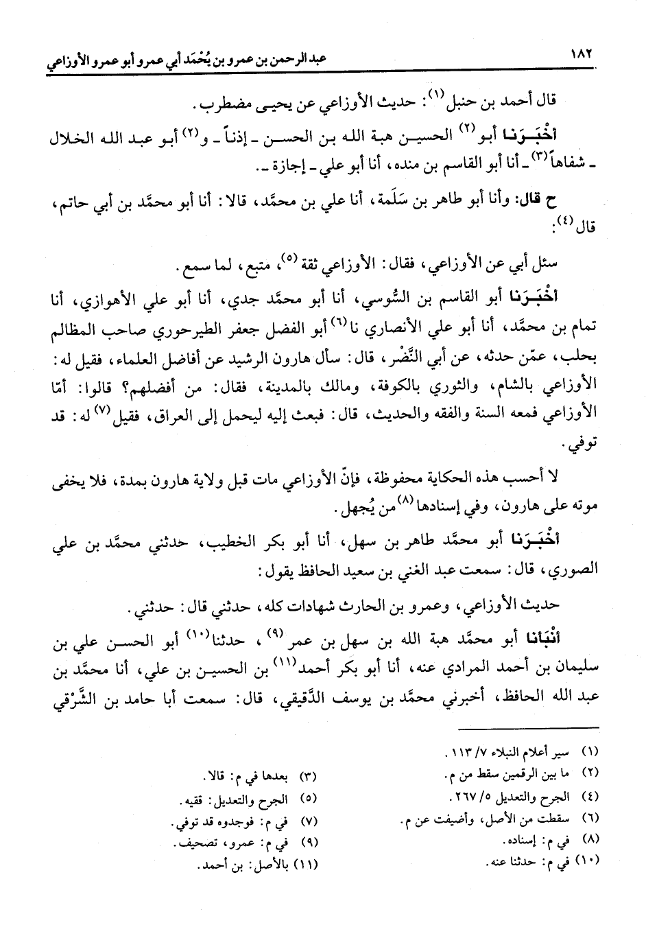 قال أحمد بن حنبل (1) حديث الأوزاعي عن يحيى مضطرب أخبرنا أبو (2) الحسين هبة الله بن الحسن اذنا و (2) أبو عبد الله الخلال شفاها (3) انا أبو القاسم بن منده انا أبو علي اجازة ح قال وأنا أبو طاهر بن سلمة انا علي بن محمد قالا انا أبو محمد بن أبي حاتم قال (4) سئل أبي عن الأوزاعي فقال الأوزاعي ثقة (5) متبع لما سمع أخبرنا أبو القاسم بن السوسي انا أبو محمد جدي انا أبو علي الأهوازي انا تمام بن محمد انا أبو علي الأنصاري نا (6) أبو الفضل جعفر الطير حوري صاحب المظالم بحلب عمن حدثه عن أبي النضر قال سأل هارون الرشيد عن أفاضل العلماء فقيل له الأوزاعي بالشام والثوري بالكوفة ومالك بالمدينة فقال من أفضلهم قالوا اما الأوزاعي فمعه السنة والفقه والحديث قال فبعث إليه ليحمل الى العراق فقيل له قد توفي لا أحسب هذه الحكاية محفوظة فإن الأوزاعي مات قبل ولاية هارون بمدة فلا يخفى موته على هارون وفي اسنادها (8) من يجهل أخبرنا أبو محمد طاهر بن سهل انا أبو بكر الخطيب حدثني محمد بن علي الصوري قال سمعت عبد الغني بن سعيد الحافظ يقول حديث الأوزاعي وعمرو بن الحارث شهادات كله حدثني قال حدثني انبأنا أبو محمد هبة الله بن سهل بن عمر (9) حدثنا (10) أبو الحسن علي بن سليمان بن أحمد المرادي عنه أنا أبو بكر أحمد (11) بن الحسين بن علي أنا محمد بن عبد الله الحافظ أخبرني محمد بن يوسف الدقيقي قال سمعت أبا حامد بن الشرقي