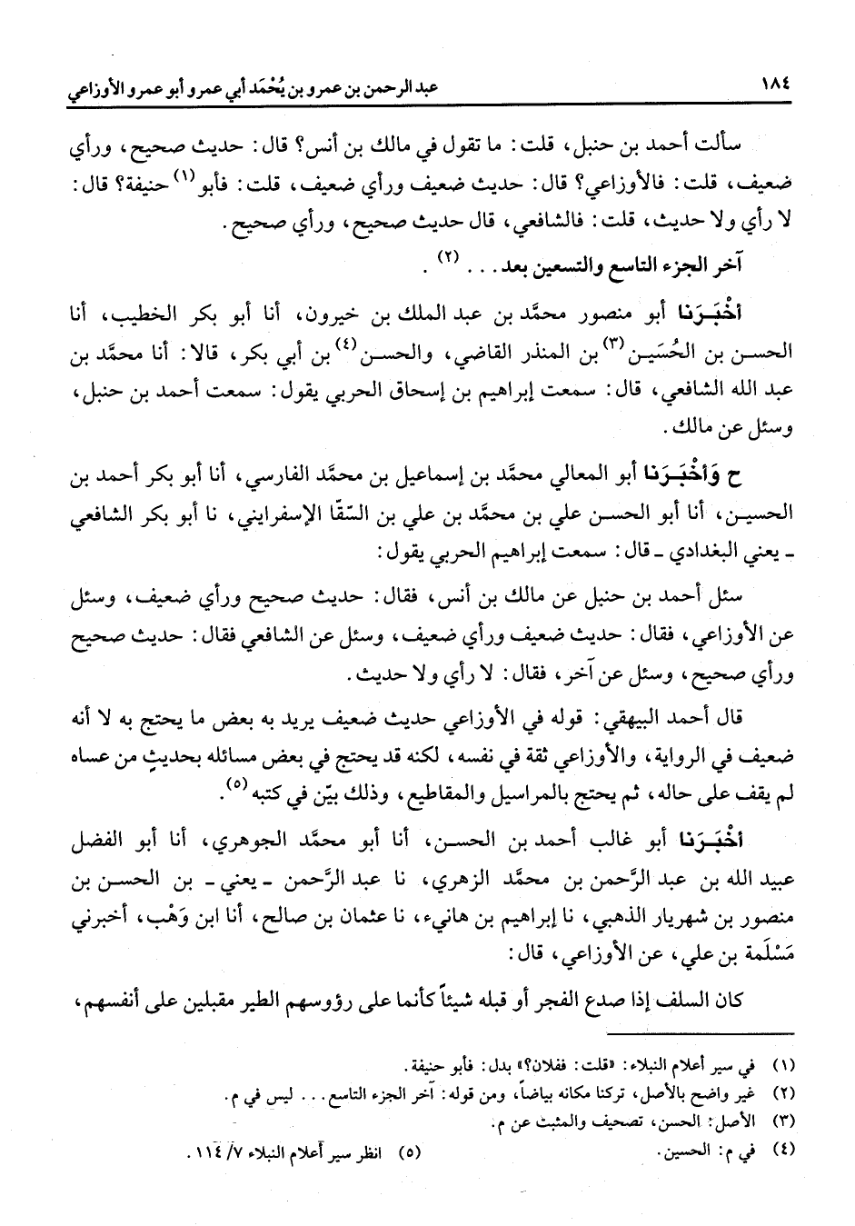 (2) أخبرنا أبو منصور محمد بن عبد الملك بن خيرون انا أبو بكر الخطيب انا الحسن بن الحسين (3) بن المنذر القاضي والحسن (4) بن أبي بكر قالا انا محمد بن عبد الله الشافعي قال سمعت ابراهيم بن اسحاق الحربي يقول سمعت أحمد بن حنبل وسئل عن مالك ح وأخبرنا أبو المعالي محمد بن اسماعيل بن محمد الفارسي انا أبو بكر احمد بن الحسين انا أبو الحسن علي بن محمد بن علي بن السقا الإسفرايني نا أبو بكر الشافعي يعني البغدادي قال سمعت ابراهيم الحربي يقول سئل أحمد بن حنبل عن مالك بن أنس فقال حديث صحيح ورأي ضعيف وسئل عن الأوزاعي فقال حديث ضعيف ورأي ضعيف وسئل عن الشافعي فقال حديث صحيح ورأي صحيح وسئل عن آخر فقال لا رأي ولا حديث قال احمد البيهقي قوله في الأوزاعي حديث ضعيف يريد به بعض ما يحتج به لا أنه ضعيف في الرواية والأوزاعي ثقة في نفسه لكنه قد يحتج في بعض مسائله بحديث من عساه لم يقف على حاله ثم يحتج بالمراسيل والمقاطيع وذلك بين في كتبه (5) أخبرنا أبو غالب احمد بن الحسن انا أبو محمد الجوهري انا أبو الفضل عبيد الله بن عبد الرحمن بن محمد الزهري نا عبد الرحمن يعني بن الحسن بن منصور بن شهريار الذهبي نا ابراهيم بن هانئ نا عثمان بن صالح انا ابن وهب اخبرني مسلمة بن علي عن الأوزاعي قال كان السلف إذا صدع الفجر أو قبله شيئا كأنما على رؤوسهم الطير مقبلين على انفسهم