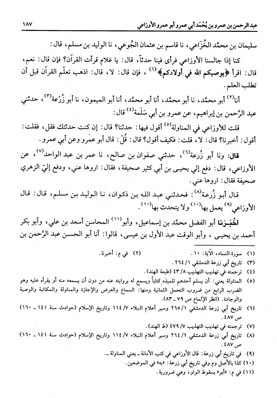 سليمان بن محمد الخزاعي نا قاسم بن عثمان الجوعي نا الوليد بن مسلم قال كنا إذا جالسنا الأوزاعي فرأى فينا حدثا قال يا غلام قرأت القرآن فإن قال نعم قال اقرأ " يوصيكم الله في أولادكم " (1) فإن قال لا قال اذهب تعلم القرآن قبل ان تطلب العلم انا (2) أبو محمد نا أبو محمد انا أبو محمد انا أبو الميمون نا أبو زرعة (3) حدثني عبد الرحمن بن ابراهيم عن عمرو بن أبي سلمة (4) قال قلت للأوزاعي في المناولة (5) اقول فيها حدثنا قال ان كنت حدثتك فقل فقلت أقول أخبرنا قال لا قلت فكيف أقول قال قل قال أبو عمرو عن أبي عمرو قال ونا أبو زرعة (6) حدثني صفوان بن صالح نا عمر بن عبد الواحد (7) عن الأوزاعي قال دفع الي يحيى بن أبي كثير صحيفة فقال اروها عني ودفع الي الزهري صحيفة فقال اروها عني قال أبو زرعة (8) فحدثني عبد الله بن ذكوان نا الوليد بن مسلم قال قال الأوزاعي (9) يعمل بها (10) ولا يتحدث بها (10) أخبرنا أبو الفضل محمد بن اسماعيل وأبو (11) المحاسن أسعد بن علي وأبو بكر احمد بن يحيى وأبو الوقت عبد الأول بن عيسى قالوا انا أبو الحسن عبد الرحمن بن