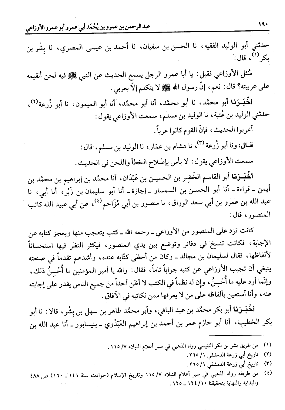 حدثني أبو الوليد الفقيه نا الحسن بن سفيان نا احمد بن عيسى المصري نا بشر بن بكر (1) قال سئل الأوزاعي فقيل يا أبا عمرو الرجل يسمع الحديث عن النبي (صلى الله عليه وسلم) فيه لحن أنيقه على عربيته قال نعم ان رسول الله (صلى الله عليه وسلم) لا يتكلم الا بعربي أخبرنا أبو محمد نا أبو محمد انا أبو محمد انا أبو الميمون نا أبو زرعة (2) حدثني الوليد بن عتبة نا الوليد بن مسلم سمعت الأوزاعي يقول أعربوا الحديث فإن القوم كانوا عربا قال ونا أبو زرعة (3) نا هشام بن عمار نا الوليد بن مسلم قال سمعت الأوزاعي يقول لا بأس بإصلاح الخطأ واللحن في الحديث أخبرنا أبو القاسم الخضر بن الحسين بن عبدان انا محمد بن ابراهيم بن محمد بن أيمن قراءة انا أبو الحسن بن السمسار اجازة انا أبو سليمان بن زبر أنا أبي نا عبد الله بن عمرو بن أبي سعد الوراق نا منصور بن أبي مزاحم (4) عن أبي عبيد الله كاتب المنصور قال كانت ترد على المنصور من الأوزاعي رحمه الله كتب يتعجب منها ويعجز كتابه عن الإجابة فكانت تنسخ في دفاتر وتوضع بين يدي المنصور فيكثر النظر فيها استحسانا لألفاظها فقال لسليمان بن مجالد وكان من أحظى كتابه عنده وأشدهم تقدما في صنعته ينبغي أن تجيب الأوزاعي عن كتبه جوابا تاما فقال والله يا أمير المؤمنين ما احسن ذلك وانما أرد عليه ما أحسن وان له نظما في الكتب لا أظن احدا من جميع الناس يقدر على اجابته عنه وانا أستعين بألفاظه على من لا يعرفها ممن نكاتبه في الآفاق أخبرنا أبو بكر محمد بن عبد الباقي وأبو محمد طاهر بن سهل بن بشر قالا نا أبو بكر الخطيب انا أبو حازم عمر بن أحمد بن ابراهيم العبدوي بنيسابور انا عبد الله بن