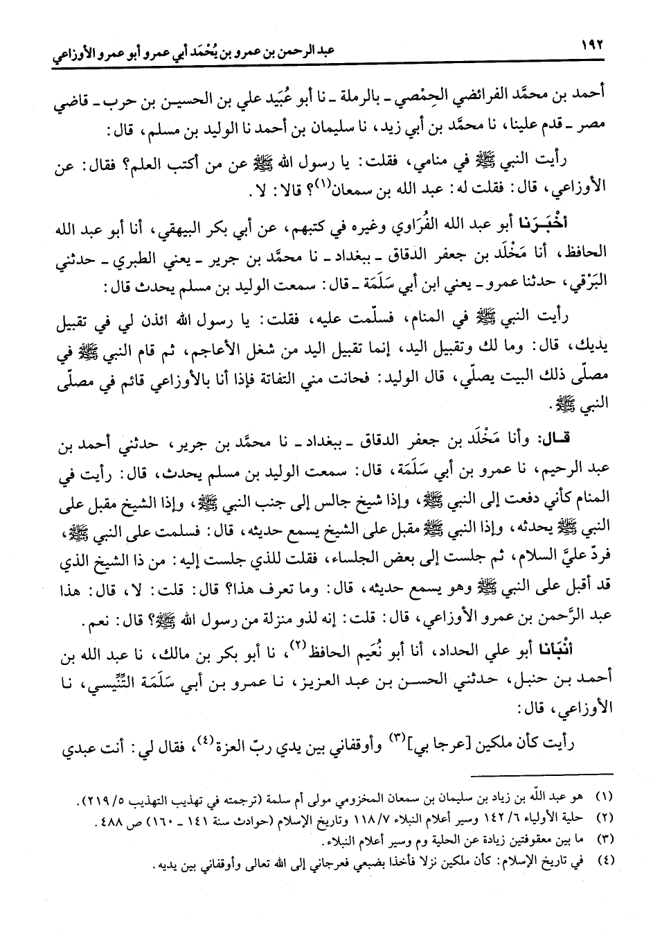 احمد بن محمد الفرائضي الحمصي بالرملة نا أبو عبيد علي بن الحسين بن حرب قاضي مصر قدم علينا نا محمد بن أبي زيد نا سليمان بن احمد نا الوليد بن مسلم قال رأيت النبي (صلى الله عليه وسلم) في منامي فقلت يارسول الله (صلى الله عليه وسلم) عن من أكتب العلم فقال عن الأوزاعي قال فقلت له عبد الله بن سمعان (1) قالا لا أخبرنا أبو عبد الله الفراوي وغيره في كتبهم عن أبي بكر البيهقي انا أبو عبد الله الحافظ انا مخلد بن جعفر الدقاق ببغداد نا محمد بن جرير يعني الطبري حدثني البرقي حدثنا عمرو يعني ابن أبي سلمة قال سمعت الوليد بن مسلم يحدث قال رأيت النبي (صلى الله عليه وسلم) في المنام فسلمت عليه فقلت يا رسول الله ائذن لي في تقبيل يديك قال ومالك وتقبيل اليد انما تقبيل اليد من شغل الأعاجم ثم قام النبي (صلى الله عليه وسلم) في مصلى ذلك البيت يصلي قال الوليد فحانت مني التفاتة فإذا انا بالأوزاعي قائم في مصلى النبي (صلى الله عليه وسلم) قال وانا مخلد بن جعفر الدقاق ببغداد نا محمد بن جرير حدثني احمد بن عبد الرحيم نا عمرو بن أبي سلمة قال سمعت الوليد بن مسلم يحدث قال رأيت في المنام كأني دفعت الى النبي (صلى الله عليه وسلم) وإذا شيخ جالس الى جنب النبي (صلى الله عليه وسلم) وإذا الشيخ مقبل على النبي (صلى الله عليه وسلم) يحدثه وإذا النبي (صلى الله عليه وسلم) مقبل على الشيخ يسمع حديثه قال فسلمت على النبي (صلى الله عليه وسلم) فرد علي السلام ثم جلست الى بعض الجلساء فقلت للذي جلست إليه من ذا الشيخ الذي قد أقبل على النبي (صلى الله عليه وسلم) وهو يسمع حديثه قال وما تعرف هذا قال قلت لا قال هذا عبد الرحمن بن عمرو الأوزاعي قال قلت انه لذو منزلة من رسول الله (صلى الله عليه وسلم) قال نعم أنبأنا أبو علي الحداد انا أبو نعيم الحافظ (2) نا أبو بكر بن مالك نا عبد الله بن احمد بن حنبل حدثني الحسن بن عبد العزيز نا عمرو بن أبي سلمة التنيسي نا الأوزاعي قال رأيت كأن ملكين [عرجا بي] (3) واوقفاني بين يدي رب العزة (4) فقال لي انت عبدي