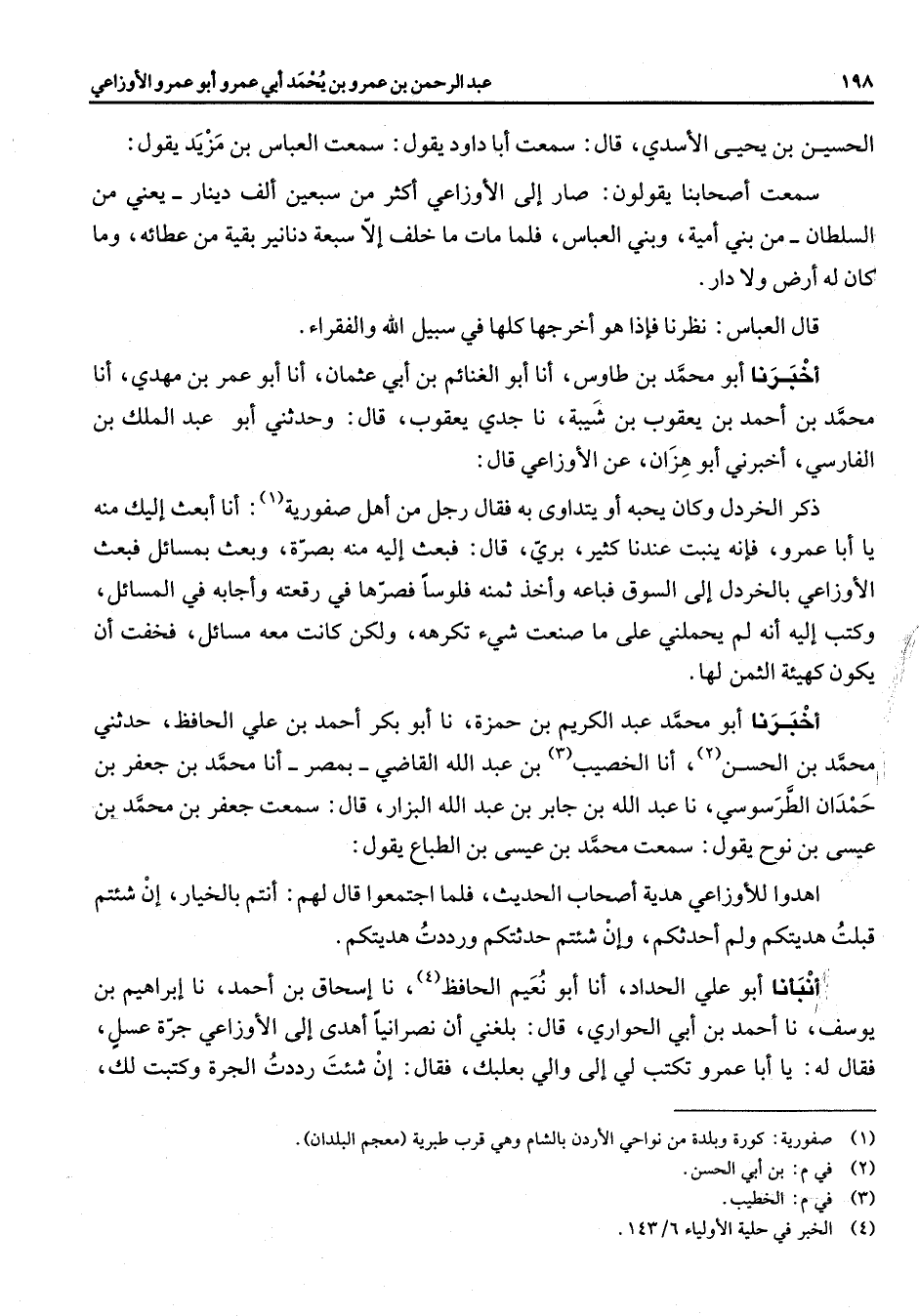 الحسين بن يحيى الأسدي قال سمعت أبا داود يقول سمعت العباس بن مزيد يقول سمعت أصحابنا يقولون صار الى الأوزاعي أكثر من سبعين ألف دينار يعني من السلطان من بني أمية وبني العباس فلما مات ما خلف الا سبعة دنانير بقية من عطائه وما كان له أرض ولا دار قال العباس نظرنا فإذا هو أخرجها كلها في سبيل الله والفقراء أخبرنا أبو محمد بن طاوس أنا أبو الغنائم بن أبي عثمان انا أبو عمر بن مهدي انا محمد بن أحمد بن يعقوب بن شيبة نا جدي يعقوب قال وحدثني أبو عبد الملك بن الفارسي أخبرني أبو هزان عن الأوزاعي قال ذكر الخردل وكان يحبه أو يتداوى به فقال رجل من أهل صفورية (1) أنا أبعث إليك منه يا أبا عمرو فإنه ينبت عندنا كثير بري قال فبعث إليه منه بصرة وبعث بمسائل فبعث الأوزاعي بالخردل الى السوق فباعه واخذ ثمنه فلوسا فصرها في رقعته واجابه في المسائل وكتب إليه انه لم يحملني على ما صنعت شئ تكرهه ولكن كانت معه مسائل فخفت أن يكون كهيئة الثمن لها اخبرنا أبو محمد عبد الكريم بن حمزة نا أبو بكر احمد بن علي الحافظ حدثني محمد بن الحسن (2) انا الخصيب (3) بن عبد الله القاضي بمصر انا محمد بن جعفر بن حمدان الطرسوسي نا عبد الله بن جابر بن عبد الله البزار قال سمعت جعفر بن محمد بن عيسى بن نوح يقول سمعت بمحمد بن عيسى بن الطباع يقول اهدوا للأوزاعي هدية أصحاب الحديث فلما اجتمعوا قال لهم انتم بالخيار ان شئتم قبلت هديتكم ولم احدثكم وان شئتم حدثتكم ورددت هديتكم انبأنا أبو علي الحداد انا أبو نعيم الحافظ (4) نا اسحاق بن احمد نا ابراهيم بن يوسف نا أحمد بن أبي الحواري قال بلغني ان نصرانيا اهدى الى الأوزاعي جرة عسل فقال له يا أبا عمرو تكتب لي الى والي بعلبك فقال ان شئت رددت الجرة وكتبت لك