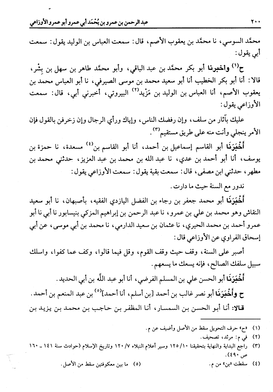 محمد السوسي نا محمد بن يعقوب الأصم قال سمعت العباس بن الوليد يقول سمعت أبي يقول ح (1) وأخبرنا أبو بكر محمد بن عبد الباقي وأبو محمد طاهر بن سهل بن بشر قالا أنا أبو بكر الخطيب انا أبو سعيد محمد بن موسى الصيرفي نا أبو العباس محمد بن يعقوب الأصم انا العباس بن الوليد بن مزيد (2) البيروتي اخبرني أبي قال سمعت الأوزاعي يقول عليك بآثار من سلف وان رفضك الناس وإياك ورأي الرجال وان زخرفن بالقول فإن الأمر ينجلي وانت منه على طريق مستقيم (3) أخبرنا أبو القاسم إسماعيل بن أحمد أنا أبو القاسم بن (4) مسعدة نا حمزة بن يوسف انا أبو أحمد بن عدي نا عبد الله بن محمد بن عبد العزيز حدثني محمد بن مطهر حدثني ابن مصفى قال سمعت بقية يقول سمعت الأوزاعي يقول ندور مع السنة حيث ما دارت أخبرنا أبو محمد جعفر بن رجاء بن الفضل اليازدي الفقيه بأصبهان نا أبو سعيد النقاش وهو محمد بن علي بن عمرو نا عبد الرحمن بن ابراهيم المزكي بنيسابور نا أبي نا أبو عمرو احمد بن محمد الحيري نا عثمان بن سعيد الدارمي نا محمد بن أبي موسى عن أبي اسحاق الفراوي عن الأوزاعي قال أصبر على السنة وقف حيث وقف القوم وقل فيما قالوا وكف عما كفوا واسلك سبيل سلفك الصالح فإنه يسعك ما يسعهم اخبرنا أبو الحسن علي بن المسلم الفرضي انا أبو عبد الله بن أبي الحديد ح وأخبرنا أبو نصر غالب بن أحمد [بن أسلم انا أحمد] (5) بن عبد المنعم بن احمد قالا انا أبو الحسن بن السمسار انا المظفر بن حاجب بن محمد بن يزيد بن
