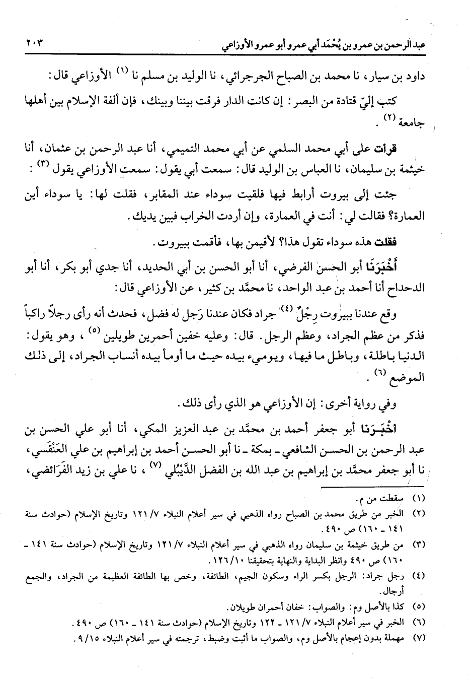 داود بن سيار نا محمد بن الصباح الجرجرائي نا الوليد بن مسلم نا (1) الأوزاعي قال كتب الي قتادة من البصر إن كانت الدار فرقت بيننا وبينك فان ألفة الاسلام بين أهلها جامعة (2) قرأت على أبي محمد السلمي عن أبي محمد التميمي انا عبد الرحمن بن عثمان انا خيثمة بن سليمان نا العباس بن الوليد قال سمعت أبي يقول سمعت الأوزاعي يقول (3) جئت الى بيروت أرابط فيها فلقيت سوداء عند المقابر فقلت لها يا سوداء أين العمارة فقالت لي انت في العمارة وان أردت الخراب فبين يديك فقلت هذه سوداء تقول هذا لأقيمن بها فأقمت ببيروت أخبرنا أبو الحسن الفرضي انا أبو الحسن بن أبي الحديد أنا جدي أبو بكر أنا أبو الدحداح أنا أحمد بن عبد الواحد نا محمد بن كثير عن الأوزاعي قال وقع عندنا ببيروت رجل (4) جراد فكان عندنا رجل له فضل فحدث انه رأى رجلا راكبا فذكر من عظم الجراد وعظم الرجل قال وعليه خفين أحمرين طويلين (5) وهو يقول الدنيا باطلة وباطل ما فيها ويومئ بيده حيث ما أومأ بيده أنساب الجراد الى ذلك الموضع (6) وفي رواية أخرى أن الأوزاعي هو الذي رأى ذلك أخبرنا أبو جعفر أحمد بن محمد بن عبد العزيز المكي انا أبو علي الحسن بن عبد الرحمن بن الحسن الشافعي بمكة نا أبو الحسن احمد بن ابراهيم بن علي العنقسي نا أبو جعفر محمد بن ابراهيم بن عبد الله بن الفضل الديبلي (7) نا علي بن زيد الفرائضي