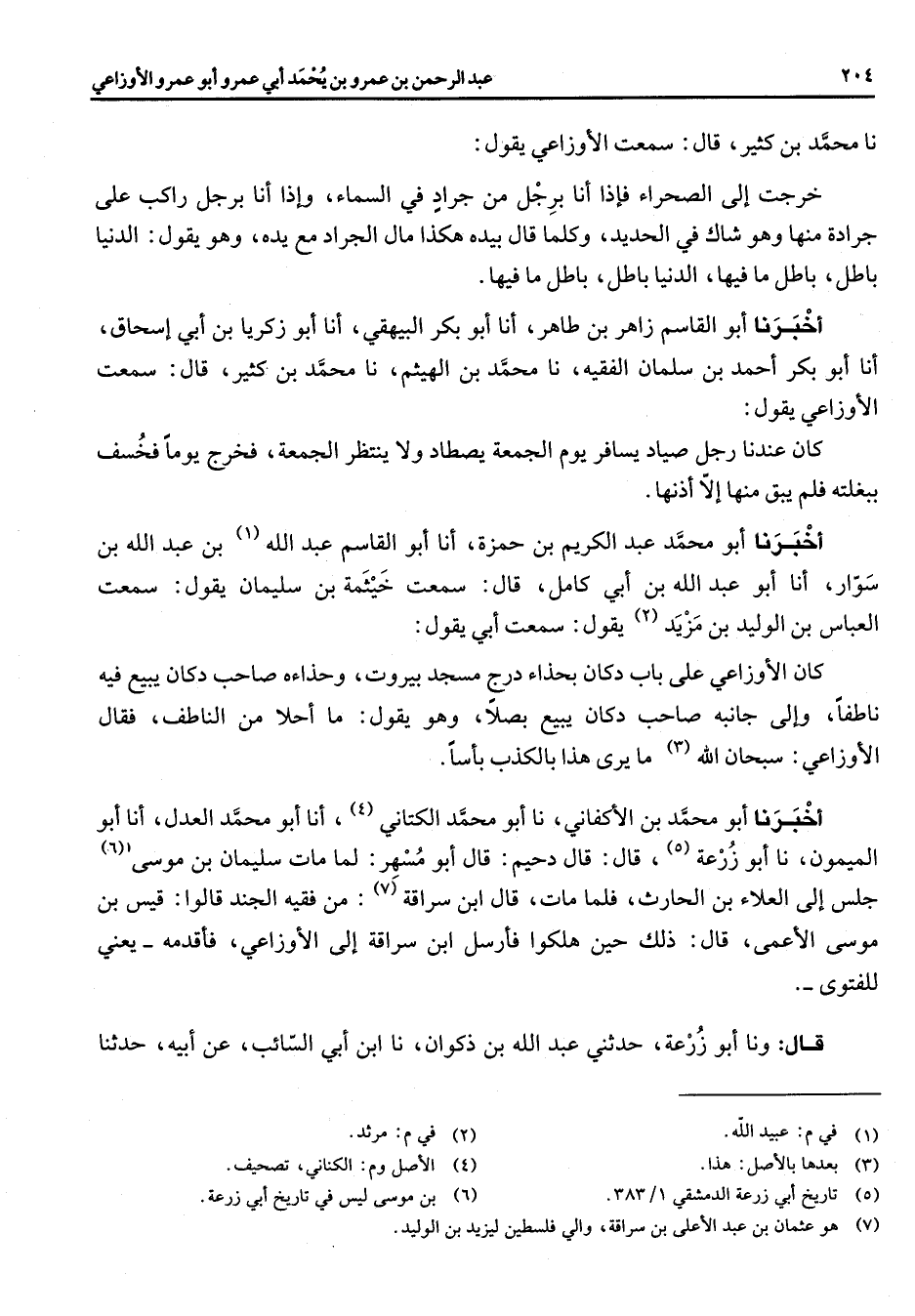 نا محمد بن كثير قال سمعت الأوزاعي يقول خرجت إلى الصحراء فإذا أنا برجل من جراد في السماء وإذا أنا برجل راكب على جرادة منها وهو شاك في الحديد وكلما قال بيده هكذا مال الجراد مع يده وهو يقول الدنيا باطل باطل ما فيها الدنيا باطل باطل ما فيها أخبرنا أبو القاسم زاهر بن طاهر انا أبو بكر البيهقي أنا أبو زكريا بن أبي إسحاق انا أبو بكر أحمد بن سلمان الفقيه نا محمد بن الهيثم نا محمد بن كثير قال سمعت الأوزاعي يقول كان عندنا رجل صياد يسافر يوم الجمعة يصطاد ولا ينتظر الجمعة فخرج يوما فخسف ببغلته فلم يبق منها الا أذنها أخبرنا أبو محمد عبد الكريم بن حمزة أنا أبو القاسم عبد الله (1) بن عبد الله بن سوار انا أبو عبد الله بن أبي كامل قال سمعت خيثمة بن سليمان يقول سمعت العباس بن الوليد بن مزيد (2) يقول سمعت أبي يقول كان الأوزاعي على باب دكان بحذاء درج مسجد بيروت وحذاءه صاحب دكان يبيع فيه ناطفا والى جانبه صاحب دكان يبيع بصلا وهو يقول ما أحلا من الناطف فقال الأوزاعي سبحان الله (3) ما يرى هذا بالكذب بأسا أخبرنا أبو محمد بن الأكفاني نا أبو محمد الكتاني (4) أنا أبو محمد العدل انا أبو الميمون نا أبو زرعة (5) قال قال دحيم قال أبو مسهر لما مات سليمان بن موسى (6) جلس إلى العلاء بن الحارث فلما مات قال ابن سراقة (7) من فقيه الجند قالوا قيس بن موسى الأعمى قال ذلك حين هلكوا فأرسل ابن سراقة الى الأوزاعي فأقده يعني للفتوى قال ونا أبو زرعة حدثني عبد الله بن ذكوان نا ابن أبي السائب عن أبيه حدثنا