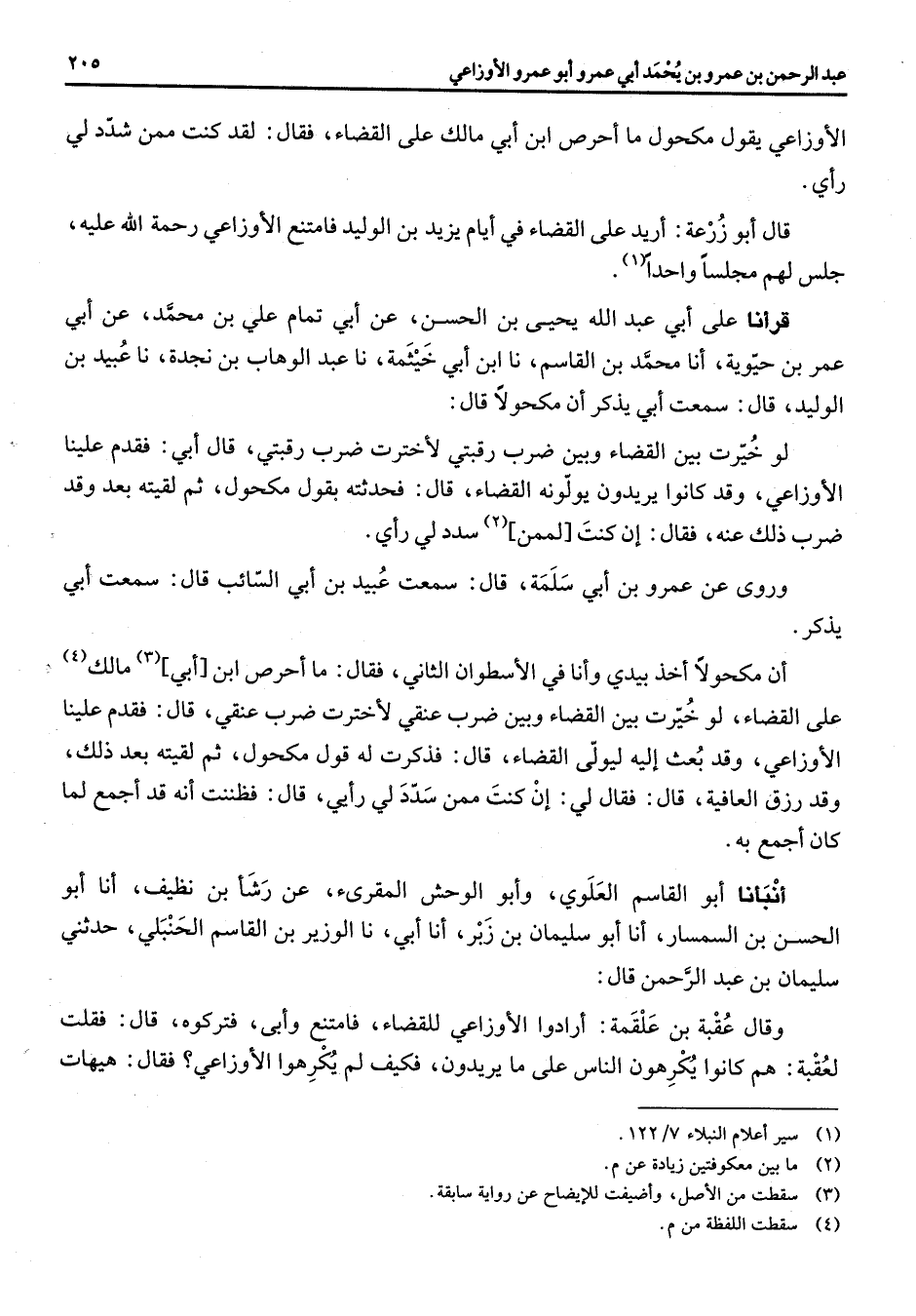 الأوزاعي يقول مكحول ما أحرص ابن أبي مالك على القضاء فقال لقد كنت ممن شدد لي رأي قال أبو زرعة أريد على القضاء في أيام يزيد بن الوليد فامتنع الأوزاعي رحمة الله عليه جلس لهم مجلسا واحدا (1) قرأنا على أبي عبد الله يحيى بن الحسن عن أبي تمام علي بن محمد عن أبي عمر بن حيوية انا محمد بن القاسم نا ابن أبي خيثمة نا عبد الوهاب بن نجدة نا عبيد بن الوليد قال سمعت أبي يذكر ان مكحولا قال لو خيرت بين القضاء وبين ضرب رقبتي لأخترت ضرب رقبتي قال أبي فقدم علينا الأوزاعي وقد كانوا يريدون يولونه القضاء قال فحدثته بقول مكحول ثم لقيته بعد وقد ضرب ذلك عنه فقال ان كنت [لممن] (2) سدد لي رأي وروى عن عمرو بن أبي سلمة قال سمعت عبيد بن أبي السائب قال سمعت أبي يذكر أن مكحولا أخذ بيدي وانا في الأسطوان الثاني فقال ما أحرص ابن [أبي] (3) مالك (4) على القضاء لو خيرت بين القضاء وبين ضرب عنقي لأخترت ضرب عنقي قال فقدم علينا الأوزاعي وقد بعث إليه ليولى القضاء قال فذكرت له قول مكحول ثم لقيته بعد ذلك وقد رزق العافية قال فقال لي ان كنت ممن سدد لي رأيي قال فظننت انه قد أجمع لما كان أجمع به أنبأنا أبو القاسم العلوي وأبو الوحش المقرئ عن رشأ بن نظيف انا أبو الحسن بن السمسار انا أبو سليمان بن زبر انا أبي نا الوزير بن القاسم الحنبلي حدثني سليمان بن عبد الرحمن قال وقال عقبة بن علقمة أرادوا الأوزاعي للقضاء فامتنع وأبي فتركوه قال فقلت لعقبة هم كانوا يكرهون الناس على ما يريدون فكيف لم يكرهوا الأوزاعي فقال هيهات