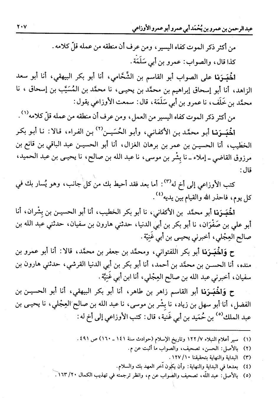 من أكثر ذكر الموت كفاه اليسير ومن عرف أن منطقه من عمله قل كلامه كذا قال والصواب عمرو بن أبي سلمة أخبرنا على الصواب أبو القاسم بن الشحامي انا أبو بكر البيهقي انا أبو سعد الزاهد انا أبو اسحاق ابراهيم بن محمد بن يحيى نا محمد بن المسيب بن اسحاق نا محمد بن خلف نا عمرو بن أبي سلمة قال سمعت الأوزاعي يقول من أكثر ذكر الموت كفاه اليسير من العمل ومن عرف أن منطقه من عمله قل كلامه (1) أخبرنا أبو محمد بن الأكفاني وأبو الحسين (2) بن الفراء قالا نا أبو بكر الخطيب انا الحسين بن عمر بن برهان الغزال انا أبو الحسين عبد الباقي بن قانع بن مرزوق القاضي املاء نا بشر بن موسى نا عبد الله بن صالح نا يحيى بن عبد الحميد قال كتب الأوزاعي الى أخ له (3) اما بعد فقد أحيط بك من كل جانب وهو يسار بك في كل يوم فاحذر الله والقيام بين يديه (4) أخبرنا أبو محمد بن الأكفاني نا أبو بكر الخطيب انا أبو الحسين بن بشران انا أبو علي بن صفوان نا أبو بكر بن أبي الدنيا حدثني هارون بن سفيان حدثني عبد الله بن صالح العجلي أخبرني يحيى بن أبي غنية ح وأخبرنا أبو بكر اللفتواني ومحمد بن جعفر بن محمد قالا انا أبو عمرو بن منده انا الحسن بن محمد بن أحمد انا أبو بكر بن أبي الدنيا القرشي حدثني هارون بن سفيان اخبرني عبد الله بن صالح العجلي انا ابن أبي غنية ح وأخبرنا أبو القاسم زاهر بن طاهر انا أبو بكر البيهقي انا أبو الحسين بن الفضل انا أبو سهل بن زياد نا بشر بن موسى نا عبد الله بن صالح العجلي نا يحيى بن عبد الملك (5) بن حميد بن أبي غنية قال كتب الأوزاعي الى أخ له