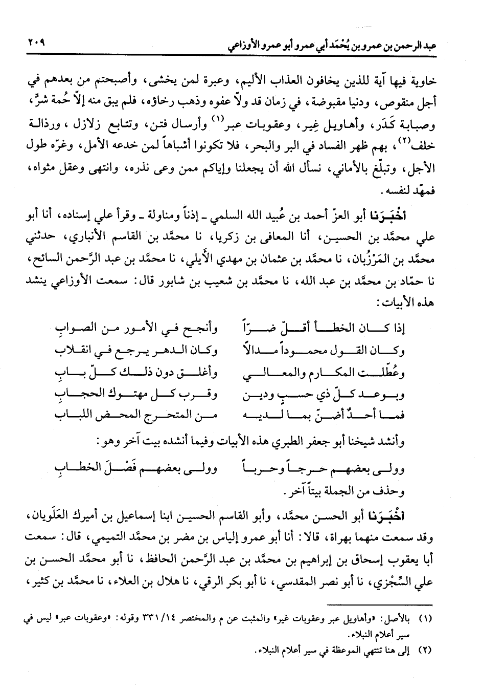 خاوية فيها آية للذين يخافون العذاب الأليم وعبرة لمن يخشى وأصبحتم من بعدهم في أجل منقوص ودنيا مقبوضة في زمان قد ولا عفوه وذهب رخاؤه فلم يبق منه الا حمة شر وصبابة كدر وأهاويل غير وعقوبات عبر (1) وأرسال فتن وتتابع زلازل ورذالة خلف (2) بهم ظهر الفساد في البر والبحر فلا تكونوا أشباها لمن خدعه الأمل وغره طول الأجل وتبلغ بالأماني نسأل الله أن يجعلنا وإياكم ممن وعى نذره وانتهى وعقل مثواه فمهد لنفسه أخبرنا أبو العز احمد بن عبيد الله السلمي إذنا ومناولة وقرأ علي اسناده انا أبو علي بن محمد بن الحسين انا المعافى بن زكريا نا محمد بن القاسم الأنباري حدثني محمد بن المرزبان نا محمد بن عثمان بن مهدي الأيلي نا محمد بن عبد الرحمن السائح نا حماد بن محمد بن عبد الله نا محمد بن شعيب بن شابور قال سمعت الأوزاعي ينشد هذه الأبيات إذا كان الخطأ أقل ضرا * وأنجح في الامور من الصواب وكان القول محمودا مدالا * وكان الدهر يرجع في انقلاب وعطلت المكارم والمعالي * وأغلق دون ذلك كل باب وبوعد كل ذي حسب ودين * وقرب كل مهتوك الحجاب فما أحد أخنن بما لديه * من المتحرج المحض اللباب * وأنشد شيخنا أبو جعفر الطبري هذه الابيات وفيما أنشده بيت آخر وهو وولى بعضهم حرجا وحربا * وولى بعضهم فصل الخطاب * وحذف من الجملة بيتا أخر أخبرنا أبو الحسن محمد وأبو القاسم الحسين ابنا اسماعيل بن أميرك العلويان وقد سمعت منهما بهراة قالا انا أبو عمرو الياس بن مضر بن محمد التميمي قال سمعت ابا يعقوب اسحاق بن ابراهيم بن محمد بن عبد الرحمن الحافظ نا أبو محمد الحسن بن علي السجزي نا أبو نصر المقدسي نا أبو بكر الرقي نا هلال بن العلاء نا محمد بن كثير