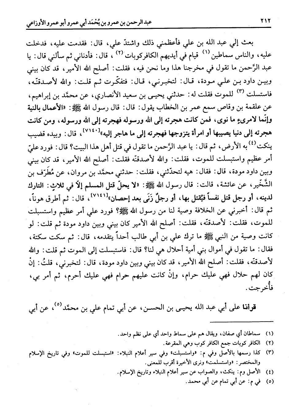 بعث الي عبد الله بن علي فأعظمني ذلك واشتد علي قال فقدمت عليه فدخلت عليه والناس سماطين (1) قيام في أيديهم الكافر كوبات (2) قال فأدناني ثم سألني قال يا عبد الرحمن ما تقول في مخرجنا هذا وما نحن فيه فقلت أصلح الله الأمير قد كان بين وببن داود بن علي مودة قال لتخبرني قال فتفكرت ثم قلت والله لأصدقنه فاستسلت (3) للموت فقلت له حدثني يحيى بن سعيد الأنصاري عن محمد بن ابراهيم عن علقمة بن وقاص سمع عمر بن الخطاب يقول قال قال رسول الله (صلى الله عليه وسلم) الأعمال بالنية وإنما لامرئ ما نوى فمن كانت هجرته إلى الله ورسوله فهجرته الى الله ورسوله ومن كانت هجرته إلى دنيا يصيبها أو امرأة يتزوجها فهجرته الى ما هاجر إليه
