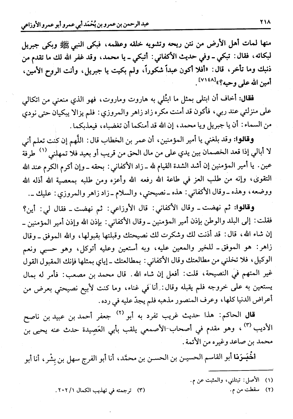 [7148] فقال اخاف أن ابتلى بمثل ما ابتلي به هاروت وماروت فهو الذي منعني من اتكالي على منزلتي عند ربي فأكون قد أمنت مكره زاد زاهر والمروزي فلم يزالا يبكيان حتى نودي من السماء ان يا جبريل ويا محمد ان الله قد أمنكما أن تغضباه فيعذبكما وقالوا وقد بلغني يا أمير المؤمنين ان عمر بن الخطاب قال اللهم إن كنت تعلم اني لا أبالي إذا قعد الخصمان بين يدي على من مال الحق من قريب أو بعيد فلا تمهلني (1) طرفة عين يا أمير المؤمنين ان أشد الشدة القيام لله زاد الأكفاني بحقه وان أكرم الكرم عند الله التقوى وإنه من طلب العز في طاعة الله رفعه الله وأعزه ومن طلبه بمعصية الله أذله الله ووضعه وهذه وقال الأكفاني هذه نصيحتي والسلام زاد زاهر والمروزي عليك وقالوا ثم نهضت وقال الأكفاني قال الأوزاعي ثم نهضت فقال لي أين فقلت الى البلد والوطن بإذن أمير المؤمنين وقال الأكفاني بإذن الله وأذن أمير المؤمنين ان شاء الله قال وقد أذنت لك وشكرت لك نصيحتك وقبلتها بقبولها والله الموفق وقال زاهر هو الموفق للخير والمعين عليه وبه أستعين وعليه أتوكل وهو حسبي ونعم الوكيل فلا تخلني من مطالعتك وقال الأكفاني بمطالعتك إياي بمثلها فإنك المقبول القول غير المتهم في النصيحة قلت أفعل إن شاء الله قال محمد بن مصعب فأمر له بمال يستعين به على خروجه فلم يقبله وقال إنا في غناء وما كنت لأبيع نصيحتي بعرض من أعراض الدنيا كلها وعرف المنصور مذهبه فلم يجد عليه في رده قال الحاكم هذا حديث غريب تفرد به أبو (2) جعفر احمد بن عبيد بن ناصح الأديب (3) وهو مقدم في أصحاب الأصمعي يلقب بأبي العصيدة حدث عنه يحيى بن محمد بن صاعد وغيره من الأئمة أخبرنا أبو القاسم الحسين بن الحسن بن محمد انا أبو الفرج سهل بن بشر انا أبو