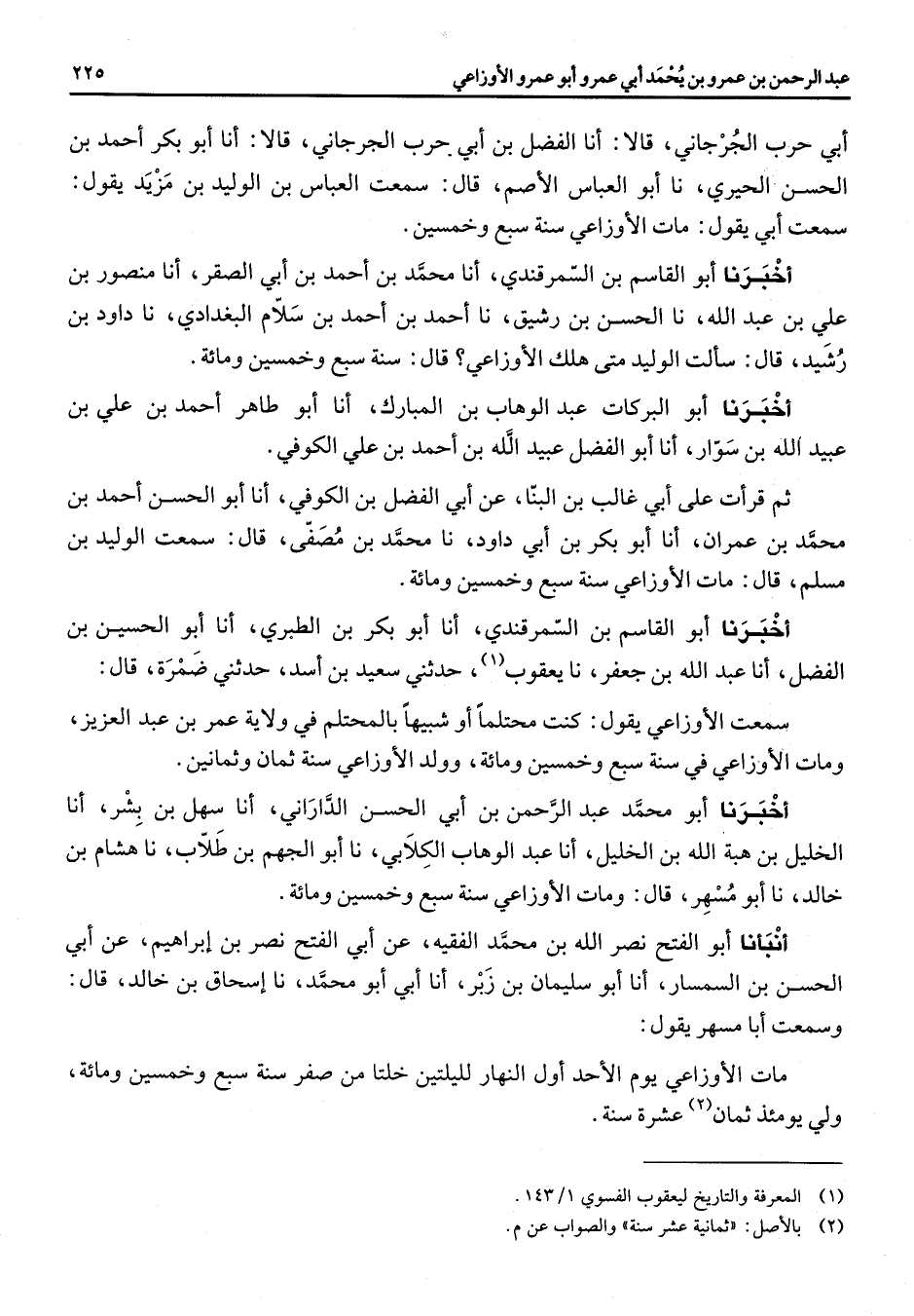 أبي حرب الجرجاني قالا انا الفضل بن أبي حرب الجرجاني قالا انا أبو بكر احمد بن الحسن الحيري نا أبو العباس الأصم قال سمعت العباس بن الوليد بن مزيد يقول سمعت أبي يقول مات الأوزاعي سنة سبع وخمسين أخبرنا أبو القاسم بن السمرقندي انا محمد بن احمد بن أبي الصقر انا منصور بن علي بن عبد الله نا الحسن بن رشيق نا احمد بن احمد بن سلام البغدادي نا داود بن رشيد قال سألت الوليد متى هلك الأوزاعي قال سنة سبع وخمسين ومائة أخبرنا أبو البركات عبد الوهاب بن المبارك انا أبو طاهر احمد بن علي بن عبيد الله بن سوار انا أبو الفضل عبيد الله بن احمد بن علي الكوفي ثم قرأت على أبي غالب بن البنا عن أبي الفضل بن الكوفي انا أبو الحسن احمد بن محمد بن عمران انا أبو بكر بن أبي داود نا محمد بن مصفى قال سمعت الوليد بن مسلم قال مات الأوزاعي سنة سبع وخمسين ومائة أخبرنا أبو القاسم بن السمرقندي انا أبو بكر بن الطبري انا أبو الحسين بن الفضل انا عبد الله بن جعفر نا يعقوب (1) حدثني سعيد بن أسد حدثني ضمرة قال سمعت الأوزاعي يقول كنت محتلما أو شبيها بالمحتلم في ولاية عمر بن عبد العزيز ومات الأوزاعي في سنة سبع وخمسين ومائة وولد الأوزاعي سنة ثمان وثمانين أخبرنا أبو محمد عبد الرحمن بن أبي الحسن الداراني انا سهل بن بشر انا الخليل بن هبة الله ن الخليل انا عبد الوهاب الكلابي نا أبو الجهم بن طلاب نا هشام بن خالد نا أبو مسهر قال ومات الأوزاعي سنة سبع وخمسين ومائة انبأنا أبو الفتح نصر الله بن محمد الفقيه عن أبي الفتح نصر بن ابراهيم عن أبي الحسن بن السمسار انا أبو سليمان بن زبر انا أبي أبو محمد نا اسحاق بن خالد قال وسمعت أبا مسهر يقول مات الأوزاعي يوم الأحد اول النهار لليلتين خلتا من صفر سنة سبع وخمسين ومائة ولي يومئذ ثمان (2) عشرة سنة