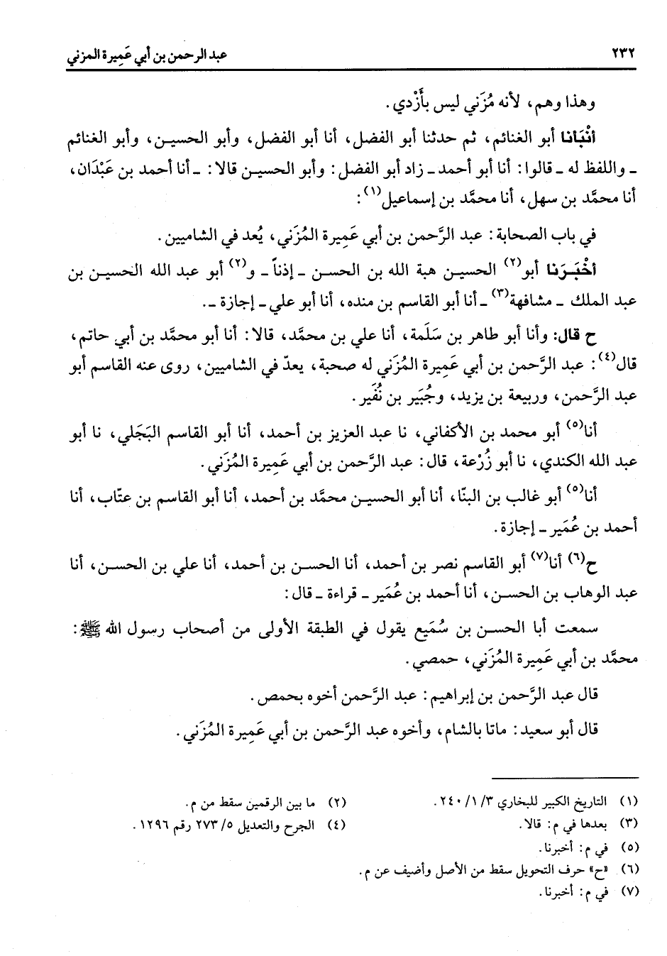 وهذا وهم لأنه مزني ليس بأزدي انبأنا أبو الغنائم ثم حدثنا أبو الفضل انا أبو الفضل وأبو الحسين وابو الغنائم واللفظ له قالوا انا أبو احمد زاد أبو الفضل وأبو الحسين قالا انا احمد بن عبدان أنا محمد بن سهل انا محمد بن اسماعيل (1) في باب الصحابة عبد الرحمن بن أبي عميرة المزني يعد في الشاميين أخبرنا أبو (2) الحسين هبة الله بن الحسن اذنا وأبو عبد الله الحسين بن عبد الملك مشافهة (3) انا أبو القاسم بن منده انا أبو علي اجازة ح قال وانا أبو طاهر بن سلمة انا علي بن محمد قالا انا أبو محمد بن أبي حاتم قال (4) عبد الرحمن بن أبي عميرة المزني له صحبة يعد في الشاميين روى عنه القاسم أبو عبد الرحمن وربيعة بن يزيد وجبير بن نفير انا (5) أبو محمد بن الأكفاني نا عبد العزيز بن أحمد انا أبو القاسم البجلي نا أبو عبد الله الكندي نا أبو زرعة قال عبد الرحمن بن أبي عميرة المزني انا (5) أبو غالب بن البنا انا أبو الحسين محمد بن أحمد انا أبو القاسم بن عتاب انا احمد بن عمير اجازة ح (6) انا (7) أبو القاسم نصر بن أحمد انا الحسن بن أحمد انا علي بن الحسن انا عبد الوهاب بن الحسن انا أحمد بن عمير قراءة قال سمعت أبا الحسن بن سميع يقول في الطبقة الأولى من أصحاب رسول الله (صلى الله عليه وسلم) محمد بن أبي عميرة المزني حمصي قال عبد الرحمن بن ابراهيم عبد الرحمن اخوه بحمص قال أبو سعيد ماتا بالشام وأخوه عبد الرحمن بن أبي عميرة المزني