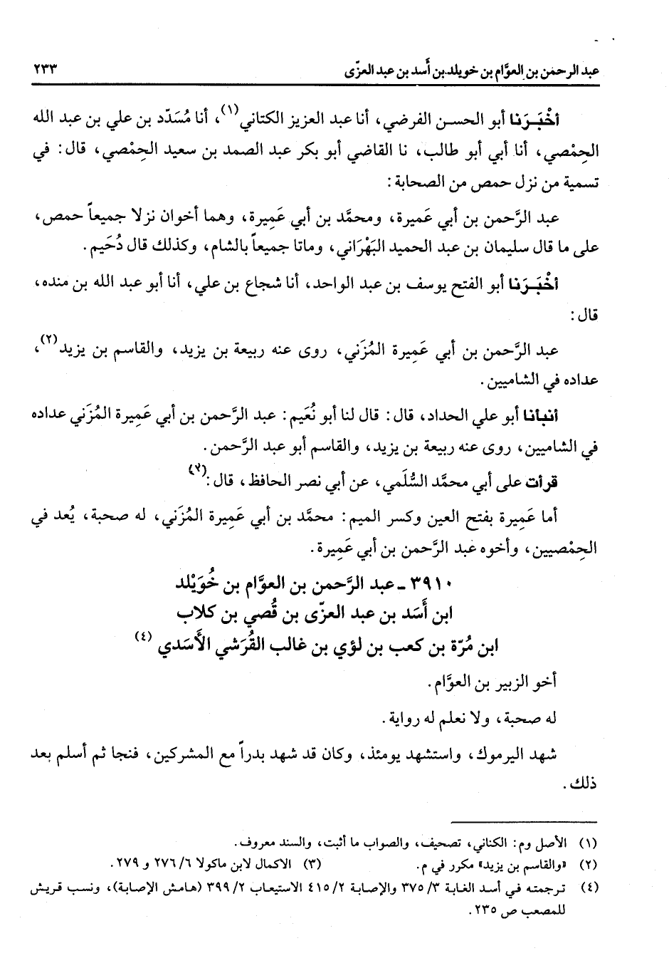 (4) ترجمته في أسد الغابة 3 / 375 والإصابة 2 / 415 الاستيعاب 2 / 399 (هامش الإصابة) ونسب قريش للمصعب ص 235