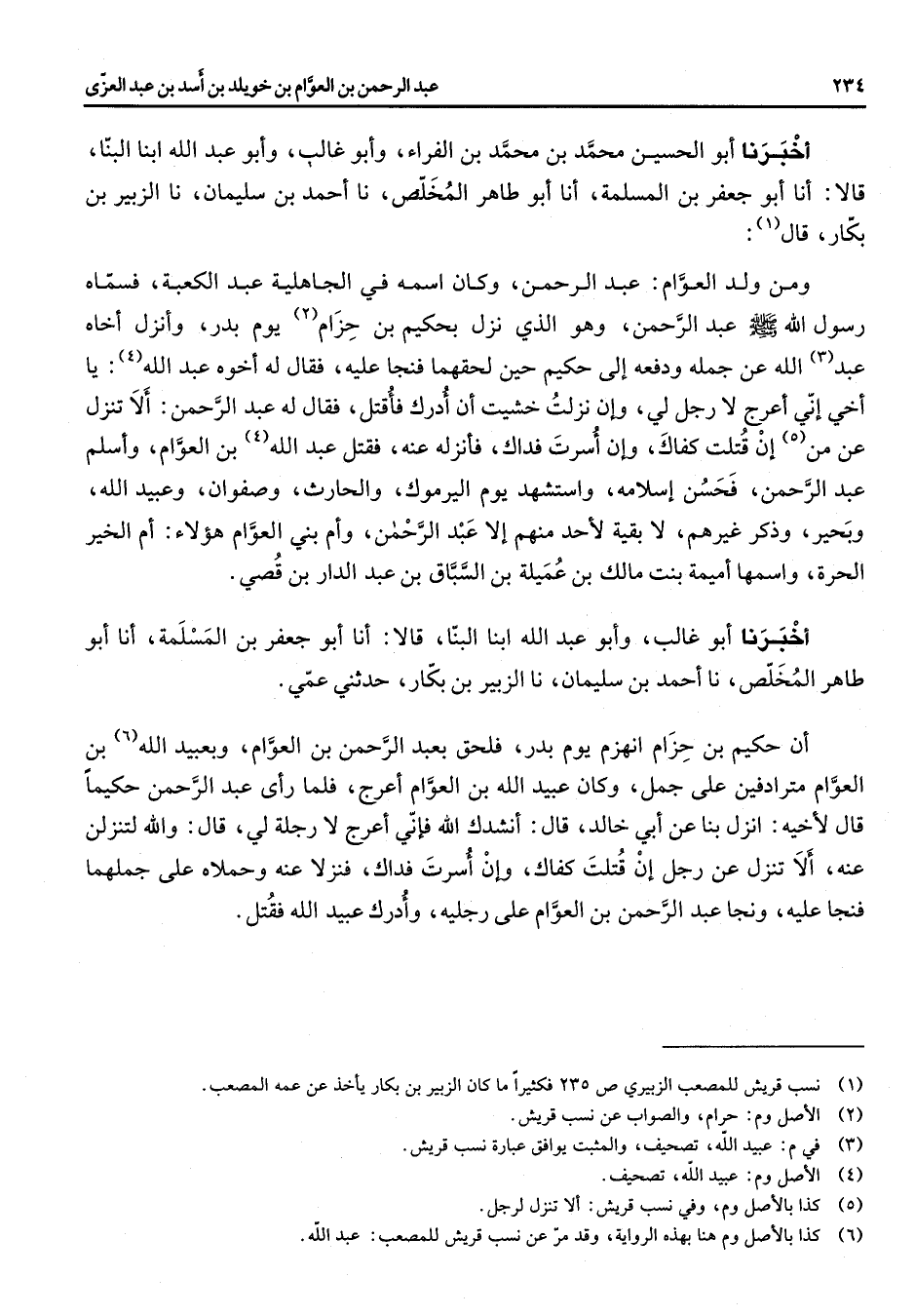 أخبرنا أبو الحسين محمد بن محمد بن الفراء وأبو غالب وأبو عبد الله ابنا البنا قالا انا أبو جعفر بن المسلمة انا أبو طاهر المخلص نا أحمد بن سليمان نا الزبير بن بكار قال (1) ومن ولد العوام عبد الرحمن وكان اسمه في الجاهلية عبد الكعبة فسماه رسول الله (صلى الله عليه وسلم) عبد الرحمن وهو الذي نزل بحكيم بن حزام (2) يوم بدر وانزل اخاه عبد (3) الله عن جمله ودفعه الى حكيم حين لحقهما فنجا عليه فقال له اخوه عبد الله (4) يا اخي اني أعرج لا رجل لي وان نزلت خشيت ان أدرك فأقتل فقال له عبد الرحمن ألا تنزل عن من (5) ان قتلت كفاك وان أسرت فداك فأنزله عنه فقتل عبد الله (4) بن العوام وأسلم عبد الرحمن فحسن اسلامه واستشهد يوم اليرموك والحارث وصفوان وعبيد الله وبحير وذكر غيرهم لا بقية لأحد منهم الا عبد الرحمن وام بني العوام هؤلاء ام الخير الحرة واسمها اميمة بنت مالك بن عميلة بن السباق بن عبد الدار بن قصي اخبرنا أبو غالب وأبو عبد الله ابنا البنا قالا انا أبو جعفر بن المسلمة انا أبو طاهر المخلص نا أحمد بن سليمان نا الزبير بن بكار حدثني عمي ان حكيم بن حزام انهزم يوم بدر فلحق بعبد الرحمن بن العوام وبعبيد الله (6) بن العوام مترادفين على جمل وكان عبيد الله بن العوام أعرج فلما رأى عبد الرحمن حكيما قال لأخيه انزل بنا عن أبي خالد قال أنشدك الله فاني أعرج لا رجلة لي قال والله لتنزلن عنه ألا تنزل عن رجل ان قتلت كفاك وان أسرت فداك فنزلا عنه وحملاه على جملهما فنجا عليه ونجا عبد الرحمن بن العوام على رجليه وأدرك عبيد الله فقتل