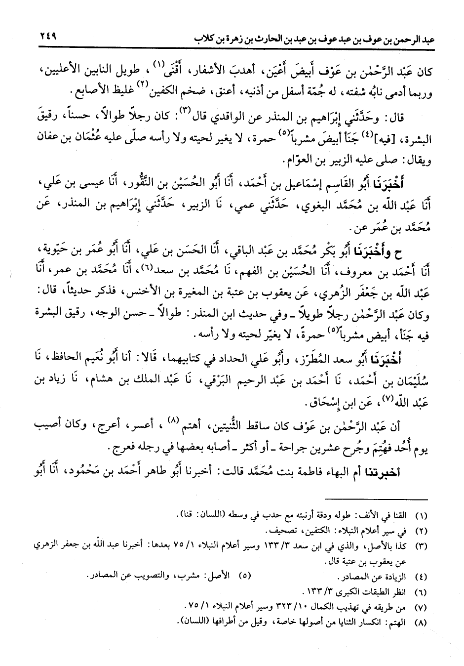 كان عبد الرحمن بن عوف أبيض أعين اهدب الاشفار أقنى (1) طويل النابين الأعليين وربما أدمى نابه شفته له جمة أسفل من أذنيه أعنق ضخم الكفين (2) غليظ الأصابع قال وحدثني ابراهيم بن المنذر عن الواقدي قال (3) كان رجلا طوالا حسنا رقيق البشرة [فيه] (4) جنأ أبيض مشربا (5) حمرة لا يغير لحيته ولا رأسه صلى عليه عثمان بن عفان ويقال صلى عليه الزبير بن العوام اخبرنا أبو القاسم اسماعيل بن احمد انا أبو الحسين بن النقور انا عيسى بن علي انا عبد الله بن محمد البغوي حدثني عمي نا الزبير حدثني ابراهيم بن المنذر عن محمد بن عمر عن ح وأخبرنا أبو بكر محمد بن عبد الباقي انا الحسن بن علي انا أبو عمر بن حيوية انا احمد بن معروف انا الحسين بن الفهم نا محمد بن سعد (6) انا محمد بن عمر انا عبد الله بن جعفر الزهري عن يعقوب بن عتبة بن المغيرة بن الأخنس فذكر حديثا قال وكان عبد الرحمن رجلا طويلا وفي حديث ابن المنذر طوالا حسن الوجه رقيق البشرة فيه جنأ أبيض مشربا (5) حمرة لا يغير لحيته ولا رأسه أخبرنا أبو سعد المطرز وأبو علي الحداد في كتابيهما قالا انا أبو نعيم الحافظ نا سليمان بن احمد نا أحمد بن عبد الرحيم البرقي نا عبد الملك بن هشام نا زياد بن عبد الله عن ابن اسحاق ان عبد الرحمن بن عوف كان ساقط الثنيتين اهتم (8) أعسر أعرج وكان أصيب يوم أحد فهتم وجرح عشرين جراحة أو أكثر أصابه بعضها في رجله فعرج أخبرتنا أم البهاء فاطمة بنت محمد قالت أخبرنا أبو طاهر أحمد بن محمود انا أبو