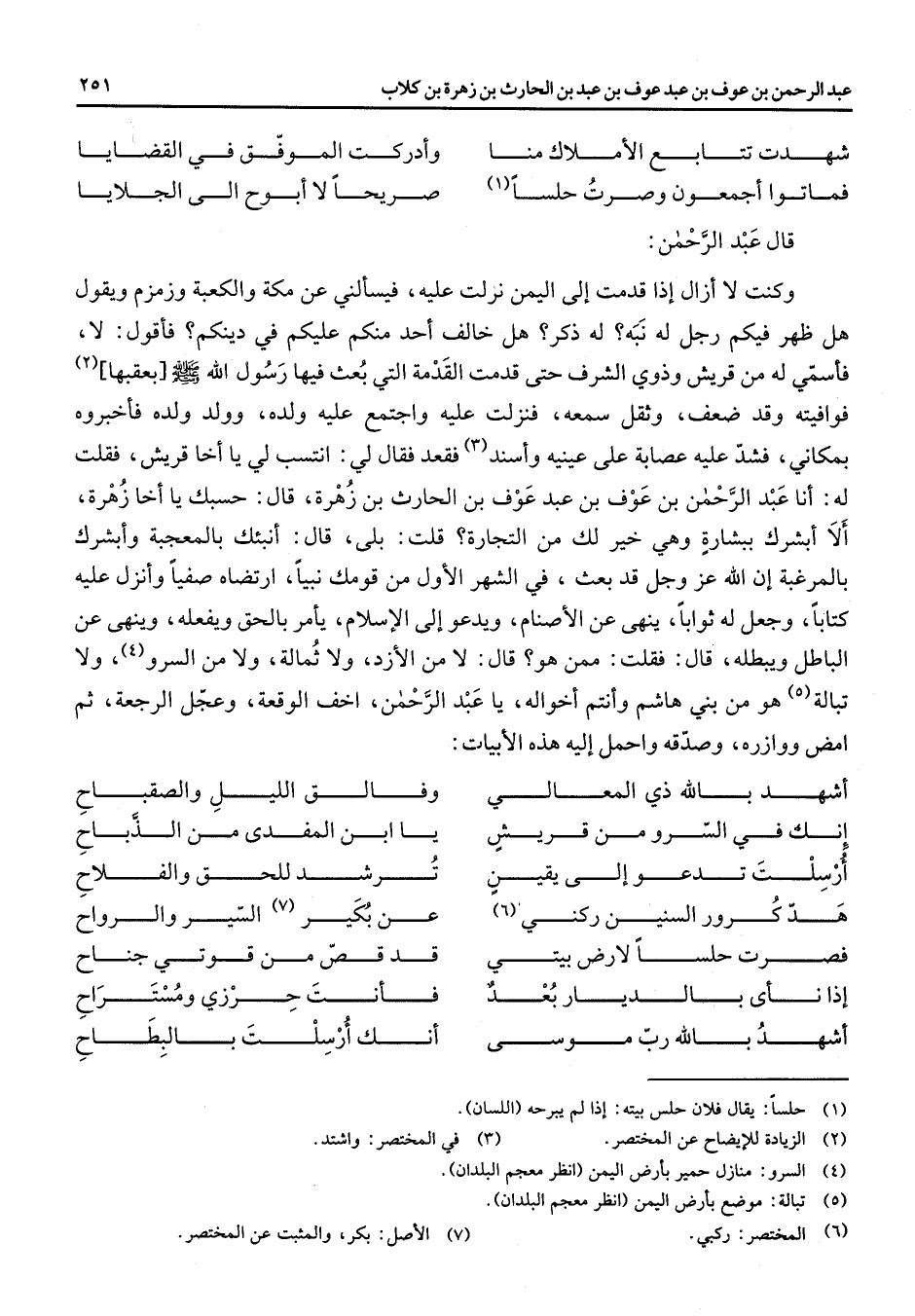 شهدت تتابع الأملاك منا * وأدركت الموفق في القضايا فماتوا اجمعون وصرت حلسا (1) * صريحا لا أبوح الى الجلايا * قال عبد الرحمن وكنت لا ازال إذا قدمت الى اليمن نزلت عليه فيسألني عن مكة والكعبة وزمزم ويقول هل ظهر فيكم رجل له نبه له ذكر هل خالف احد منكم عليكم في دينكم فأقول لا فأسمي له من قريش وذوي الشرف حتى قدمت القدمة التى بعث فيها رسول الله (صلى الله عليه وسلم) [بعقبها] (2) فوافيته وقد ضعف وثقل سمعه فنزلت عليه واجتمع عليه ولده وولد ولده فأخبروه بمكاني فشد عليه عصابة على عينيه وأسند (3) فقعد فقال لي انتسب لي يا اخا قريش فقلت له انا عبد الرحمن بن عوف بن عبد عوف بن الحارث بن زهرة قال حسبك يا اخا زهرة الا أبشرك ببشارة وهي خير لك من التجارة قلت بلى قال أنبئك بالمعجبة وأبشرك بالمرغبة ان الله عز وجل قد بعث في الشهر الاول من قومك نبيا ارتضاه صفيا وأنزل عليه كتابا وجعل له ثوابا ينهى عن الأصنام ويدعو الى الاسلام يامر بالحق ويفعله وينهى عن الباطل ويبطله قال فقلت ممن هو قال لا من الأزد ولا ثمالة ولا من السرو (4) ولا تبالة (5) هو من بني هاشم وانتم أخواله يا عبد الرحمن اخف الوقعة وعجل الرجعة ثم امض ووازره وصدقه واحمل إليه هذه الابيات أشهد بالله ذي المعالي * وفالق الليل والصقباح انك في السرو من قريش * يا ابن المفدى من الذباح أرسلت تدعو الى يقين * ترشد للحق والفلاح هد كرور السنين ركني (6) * عن بكير (7) السير والرواح فصرت حلسا لارض بيتي * قد قص من قوتي جناح إذا نأى بالديار بعد * فانت حرزي ومستراح أشهد بالله رب موسى * أنك أرسلت بالبطاح