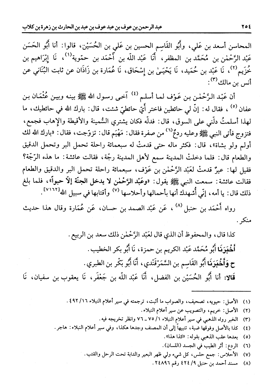 المحاسن أسعد بن علي وأبو القاسم الحسين بن علي بن الحسين قالوا انا أبو الحسن عبد الرحمن بن محمد بن المظفر انا عبد الله بن أحمد بن حموية (1) نا ابراهيم بن خزيم (2) نا عبد بن حميد نا يحيى بن اسحاق نا عمارة بن زاذان عن ثابت البناني عن أنس بن مالك (3) ان عبد الرحمن بن عوف لما أسلم (4) آخى رسول الله (صلى الله عليه وسلم) بينه وبين عثمان بن عفان (5) فقال له ان لي حائطين فاختر أي حائطي شئت قال بارك الله في حائطيك ما لهذا أسلمت دلني على السوق قال فدله فكان يشتري السمينة والأقيطة والاهاب فجمع فتزوج فأتى النبي (صلى الله عليه وسلم) وعليه ردع (6) من صفرة فقال مهيم قال تزوجت فقال بارك الله لك أولم ولو بشاة قال فكثر ماله حتى قدمت له سبعمائة راحلة تحمل البر وتحمل الدقيق والطعام قال فلما دخلت المدينة سمع لأهل المدينة رجة فقالت عائشة ما هذه الرجة فقيل لها عير قدمت لعبد الرحمن بن عوف سبعمائة راحلة تحمل البر والدقيق والطعام فقالت عائشة سمعت النبي (صلى الله عليه وسلم) يقول وعبد الرحمن لا يدخل الجنة الا حبوا فلما بلغ ذلك قال يا امه اني أشهدك انها بأحمالها وأحلاسها (7) وأقتابها في سبيل الله