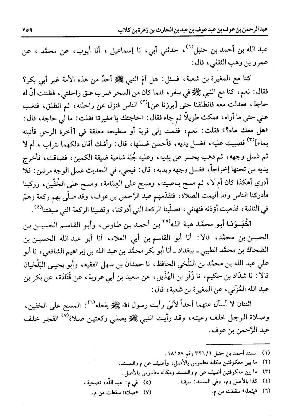 عبد الله بن احمد بن حنبل (1) حدثني أبي نا اسماعيل أنا أيوب عن محمد عن عمرو بن وهب الثقفي قال كنا مع المغيرة بن شعبة فسئل هل ام النبي (صلى الله عليه وسلم) أحد من هذه الأمة غير أبي بكر فقال نعم كنا مع النبي (صلى الله عليه وسلم) في سفر فلما كان من السحر ضرب عنق راحلتي فظننت ان له حاجة فعدلت معه فانطلقنا حتى [برزنا عن] (2) الناس فنزل عن راحلته ثم انطلق فتغيب عني حتى ما أراه فمكث طويلا ثم جاء فقال حاجتك يا مغيرة فقلت مالي حاجة قال هل معك ماء فقلت نعم فقمت الى قربة أو سطيحة معلقة في [أخرة الرحل فأتيته بماء] (3) فصببت عليه فغسل يديه فأحسن غسلها قال وأشك أقال دلكهما بتراب ام لا ثم غسل وجهه ثم ذهب يحسر عن يديه وعليه جبة شامية ضيقة الكمين فضاقت فأخرج يديه من تحتها اخراجا فغسل وجهه ويديه قال فيجئ في الحديث غسل الوجه مرتين فلا أدري اهكذا كان ام لا ثم مسح بناصيته ومسح على العمامة ومسح على الخفين وركبنا فأدركنا الناس وقد أقيمت الصلاة فتقدمهم عبد الرحمن بن عوف وقد صلى بهم ركعة وهم في الثانية فذهبت أؤذنه فنهاني فصلينا الركعة التى أدركنا وقضينا الركعة التى سبقتنا (4) أخبرنا أبو محمد هبة الله (5) بن احمد بن طاوس وابو القاسم الحسين بن الحسن بن محمد قالا انا أبو القاسم بن أبي العلاء انا أبو عبد الله الحسين بن الضحاك بن محمد الطيبي ببغداد انا أبو بكر محمد بن عبد الله بن ابراهيم الشافعي نا أبو علي عبد الله بن محمد بن البلخي الحافظ نا حمدان بن سهل الفقيه وأبو يحيى البلخيان قالا نا شداد بن حكيم نا زفر بن الهذيل عن سعيد بن أبي عروبة عن قتادة عن بكر بن عبد الله المزني عن المغيرة بن شعبة قال اثنتان لا أسأل عنهما أحدا لأني رأيت رسول الله (صلى الله عليه وسلم) يفعله (6) المسح على الخفين وصلاة الرجل خلف رعيته وقد رأيت النبي (صلى الله عليه وسلم) يصلي ركعتين صلاة (7) الفجر خلف عبد الرحمن بن عوف