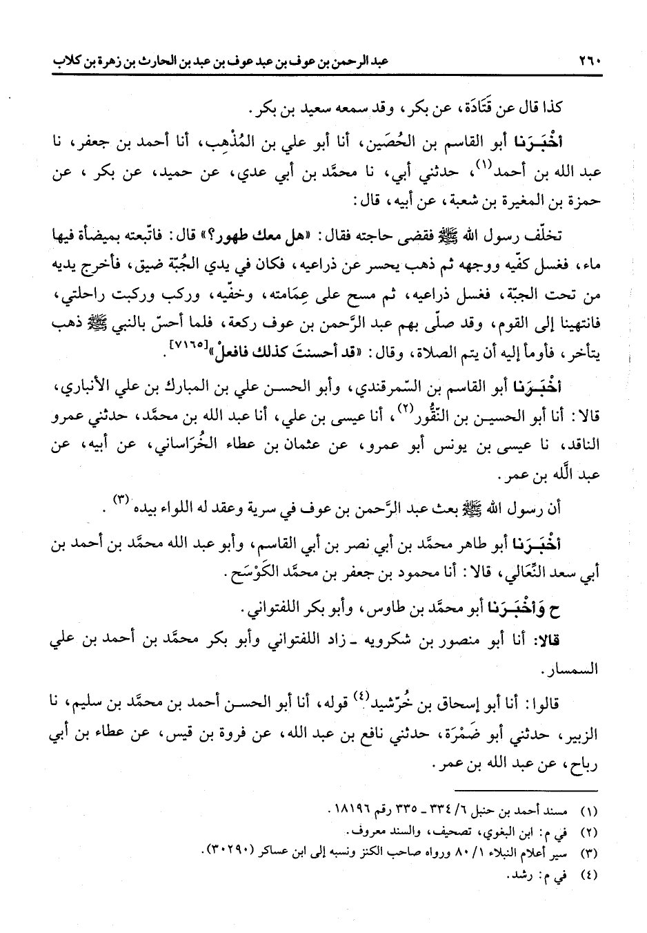 [7165] أخبرنا أبو القاسم بن السمرقندي وأبو الحسن علي بن المبارك بن علي الأنباري قالا انا أبو الحسين بن النقور (2) انا عيسى بن علي انا عبد الله بن محمد حدثني عمرو الناقد نا عيسى بن يونس أبو عمرو عن عثمان بن عطاء الخراساني عن أبيه عن عبد الله بن عمر ان رسول الله (صلى الله عليه وسلم) بعث عبد الرحمن بن عوف في سرية وعقد له اللواء بيده (3) أخبرنا أبو طاهر محمد بن أبي نصر بن أبي القاسم وأبو عبد الله محمد بن احمد بن أبي سعد النعالي قالا انا محمود بن جعفر بن محمد الكوسح ح وأخبرنا أبو محمد بن طاوس وأبو بكر اللفتواني قالا انا أبو منصور بن شكرويه زاد اللفتواني وأبو بكر محمد بن احمد بن علي السمسار قالوا انا أبو اسحاق بن خرشيد (4) قوله انا أبو الحسن احمد بن محمد بن سليم نا الزبير حدثني أبو ضمرة حدثني نافع بن عبد الله عن فروة بن قيس عن عطاء بن ابي رباح عن عبد الله بن عمر