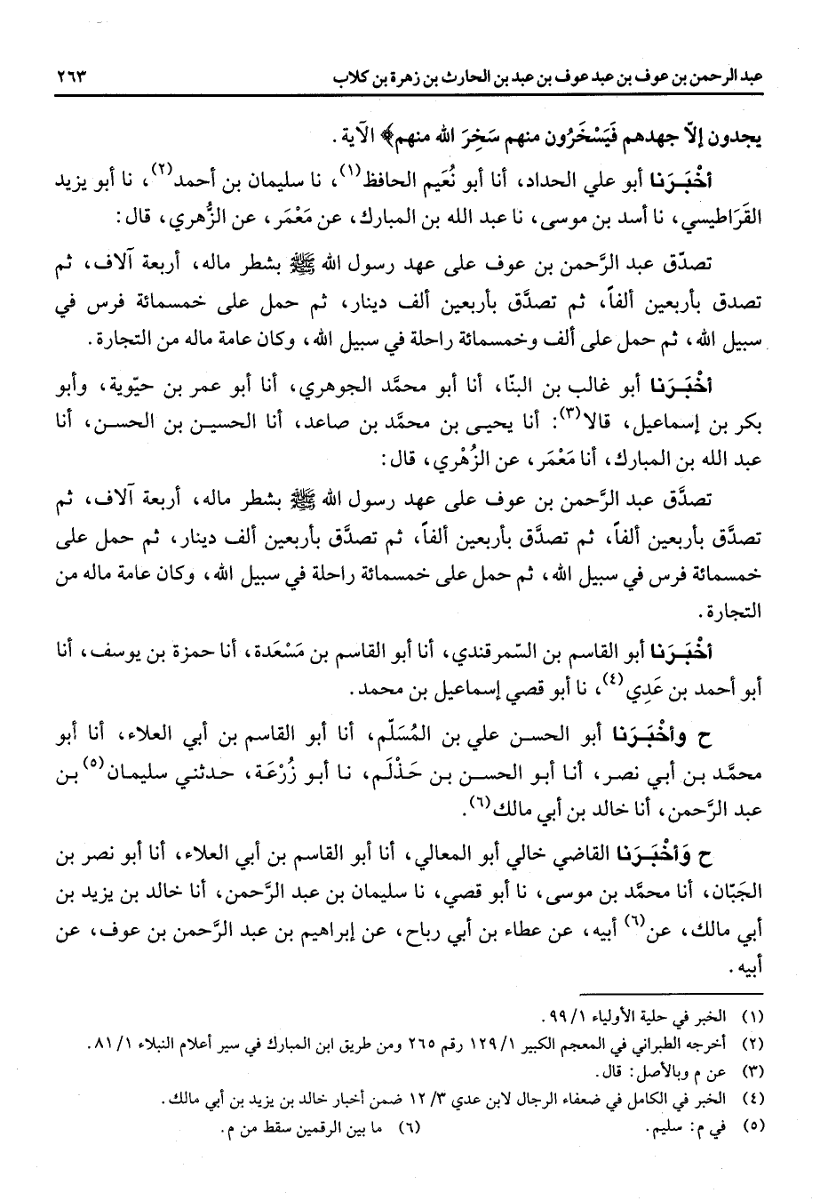 يجدون الا جهدهم فيسخرون منهم سخر الله منهم " الآية أخبرنا أبو علي الحداد انا أبو نعيم الحافظ (1) نا سليمان بن احمد (2) نا أبو يزيد القراطيسي نا أسد بن موسى نا عبد الله بن المبارك عن معمر عن الزهري قال تصدق عبد الرحمن بن عوف على عهد رسول الله (صلى الله عليه وسلم) بشطر ماله أربعة آلاف ثم تصدق بأربعين ألفا ثم تصدق بأربعين الف دينار ثم حمل على خمسمائة فرس في سبيل الله ثم حمل على ألف وخمسمائة راحلة في سبيل الله وكان عامة ماله من التجارة أخبرنا أبو غالب بن البنا انا أبو محمد الجوهري أنا أبو عمر بن حيوية وأبو بكر بن اسماعيل قالا (3) انا يحيى بن محمد بن صاعد انا الحسين بن الحسن انا عبد الله بن المبارك انا معمر عن الزهري قال تصدق عبد الرحمن بن عوف على عهد رسول الله (صلى الله عليه وسلم) بشطر ماله أربعة الآف ثم تصدق بأربعين ألفا ثم تصدق بأربعين ألفا ثم تصدق بأربعين ألف دينار ثم حمل على خمسمائة فرس في سبيل الله ثم حمل على خمسمائة راحلة في سبيل الله وكان عامة ماله من التجارة أخبرنا أبو القاسم بن السمرقندي انا أبو القاسم بن مسعدة انا حمزة بن يوسف انا أبو أحمد بن عدي (4) نا أبو قصي اسماعيل بن محمد ح وأخبرنا أبو الحسن علي بن المسلم انا أبو القاسم بن ابي العلاء انا أبو محمد بن أبي نصر انا أبو الحسن بن حذلم نا أبو زرعة حدثني سليمان (5) بن عبد الرحمن انا خالد بن أبي مالك (6) ح وأخبرنا القاضي خالي أبو المعالي انا أبو القاسم بن أبي العلاء أنا أبو نصر بن الجبان انا محمد بن موسى نا أبو قصي نا سليمان بن عبد الرحمن انا خالد بن يزيد بن ابي مالك عن (6) أبيه عن عطاء بن ابي رباح عن ابراهيم بن عبد الرحمن بن عوف عن أبيه