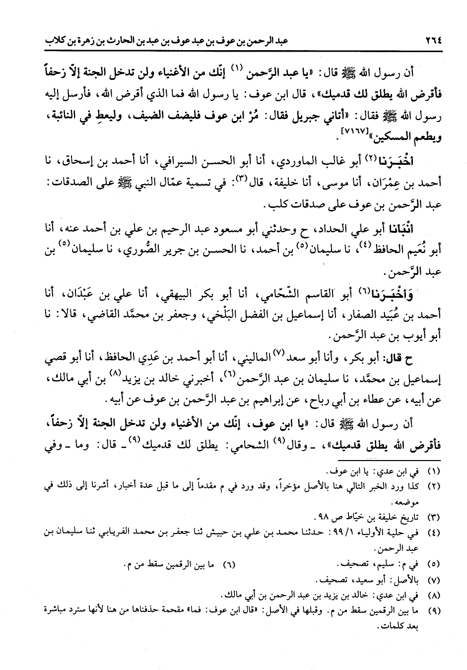 [7167] اخبرنا (2) أبو غالب الماوردي انا أبو الحسن السيرافي انا احمد بن اسحاق نا احمد بن عمران انا موسى انا خليفة قال (3) في تسمية عمال النبي (صلى الله عليه وسلم) على الصدقات عبد الرحمن بن عوف على صدقات كلب انبأنا أبو علي الحداد ح وحدثني أبو مسعود عبد الرحيم بن علي بن احمد عنه انا أبو نعيم الحافظ (4) نا سليمان (5) بن احمد نا الحسن بن جرير الصوري نا سليمان (5) بن عبد الرحمن وأخبرنا (6) أبو القاسم الشحامي انا أبو بكر البيهقي انا علي بن عبدان انا احمد بن عبيد الصفار انا اسماعيل بن الفضل البلخي وجعفر بن محمد القاضي قالا انا أبو أيوب بن عبد الرحمن ح قال أبو بكر وأنا أبو سعد (7) الماليني انا أبو احمد بن عدي الحافظ انا أبو قصي اسماعيل بن محمد نا سليمان بن عبد الرحمن (6) اخبرني خالد بن يزيد (8) بن أبي مالك عن أبيه عن عطاء بن ابي رباح عن ابراهيم بن عبد الرحمن بن عوف عن أبيه ان رسول الله (صلى الله عليه وسلم) قال يا ابن عوف انك من الأغنياء ولن تدخل الجنة الا زحفا فأقرض الله يطلق قدميك وقال (9) الشحامي يطلق لك قدميك (9) قال وما وفي