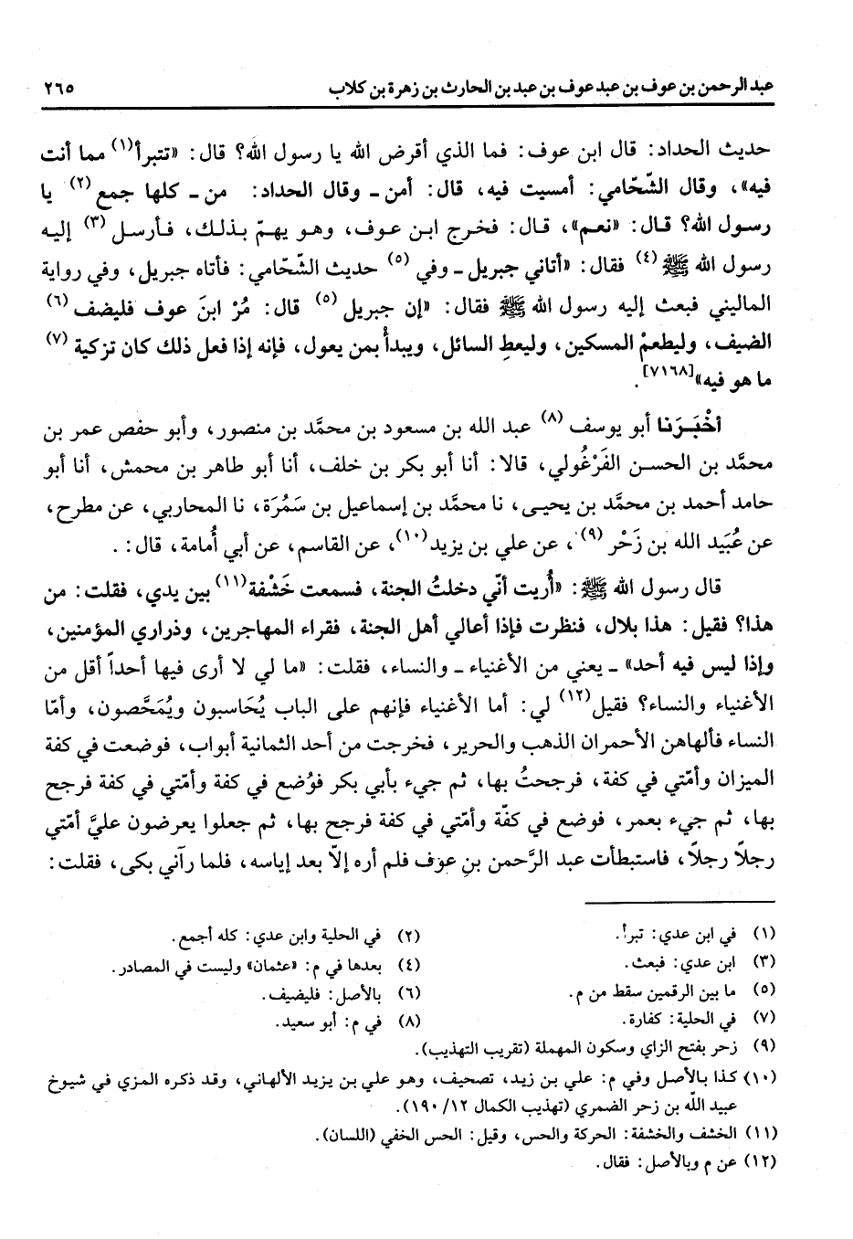 حديث الحداد قال ابن عوف فما الذي أقرض الله يارسول الله قال تتبرأ (1) مما أانت فيه وقال الشحامي امسيت فيه قال امن وقال الحداد من كلها جمع (2) يا رسول الله قال نعم قال فخرج ابن عوف وهو يهم بذلك فأرسل (3) إليه رسول الله (صلى الله عليه وسلم) (4) فقال اتاني جبريل وفي (5) حديث الشحامي فأتاه جبريل وفي رواية الماليني فبعث إليه رسول الله (صلى الله عليه وسلم) فقال إن جبريل (5) قال مر ابن عوف فليضف (6) الضيف وليطعم المسكين وليعط السائل ويبدأ بمن يعول فإنه إذا فعل ذلك كان تزكية (7) ما هو فيه