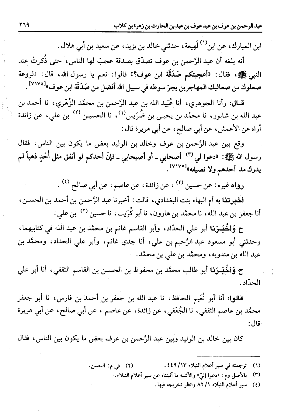 [7174] قال وانا الجوهري انا عبيد الله بن عبد الرحمن بن محمد الزهري نا أحمد بن عبد الله بن شابور نا محمد بن يحيى بن ضريس (1) نا الحسين (2) بن علي عن زائدة أراه عن الأعمش عن أبي صالح عن أبي هريرة قال وقع بين عبد الرحمن بن عوف وخالد بن الوليد بعض ما يكون بين الناس فقال رسول الله (صلى الله عليه وسلم) دعوا لي (3) أصحابي أو أصيحابي فان أحدكم لو انفق مثل احد ذهبا لم يدرك مد احدهم ولا نصيفه