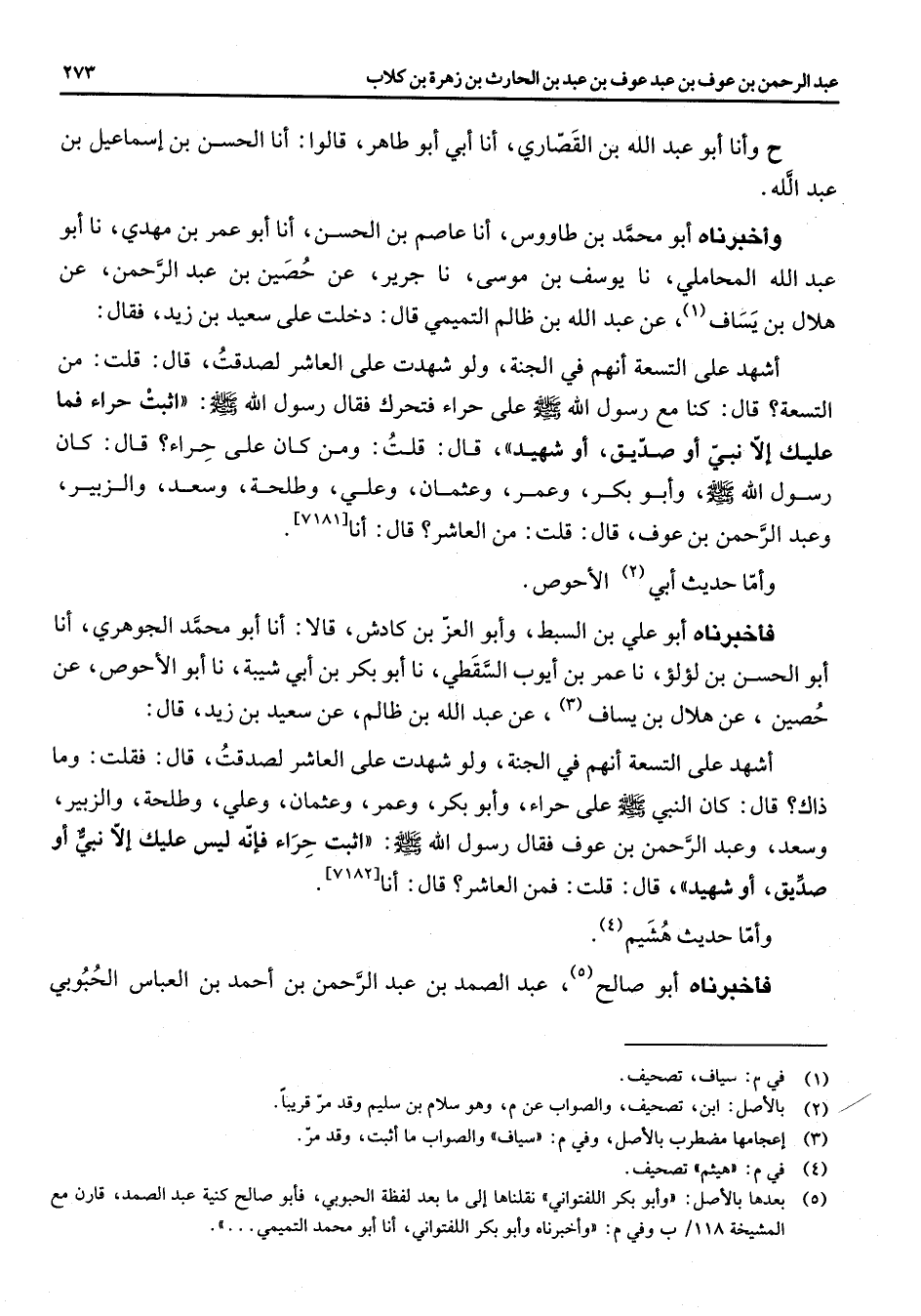 [7181] وأما حديث أبي (2) الحوص فأخبرناه أبو علي بن السبط وابو العز بن كادش قالا انا أبو محمد الجوهري انا أبو الحسن بن لؤلؤ نا عمر بن أيوب السقطي نا أبو بكر بن أبي شيبة نا أبو الحوص عن حصين عن هلال بن يساف (3) عن عبد الله بن ظالم عن سعيد بن زيد قال أشهد على التسعة انهم في الجنة ولو شهدت على العاشر لصدقت قال فقلت وما ذاك قال كان النبي (صلى الله عليه وسلم) على حراء وأبو بكر وعمر وعثمان وعلي وطلحة والزبير وسعد وعبد الرحمن بن عوف فقال رسول الله (صلى الله عليه وسلم) اثبت حراء فإنه ليس عليك الا نبي أو صديق أو شهيد قال قلت فمن العاشر قال انا