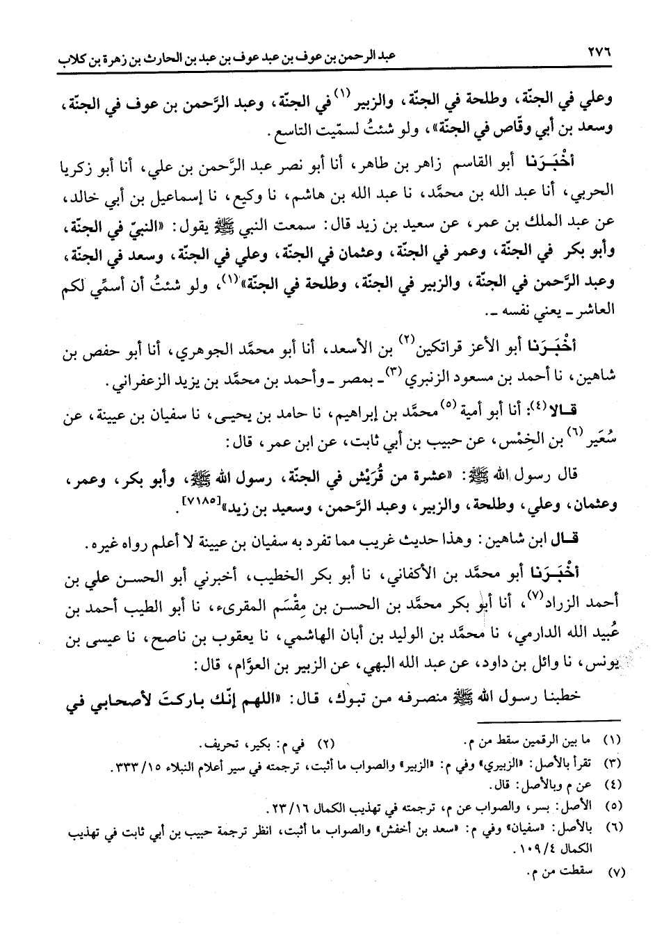 وعلي في الجنة وطلحة في الجنة والزبير (1) في الجنة وعبد الرحمن بن عوف في الجنة وسعد بن أبي وقاص في الجنة ولو شئت لسميت التاسع أخبرنا أبو القاسم زاهر بن طاهر انا أبو نصر عبد الرحمن بن علي أنا أبو زكريا الحربي انا عبد الله بن محمد نا عبد الله بن هاشم نا وكيع نا اسماعيل بن أبي خالد عن عبد الملك بن عمر عن سعيد بن زيد قال سمعت النبي (صلى الله عليه وسلم) يقول النبي في الجنة وأبو بكر في الجنة وعمر في الجنة وعثمان في الجنة وعلي في الجنة وسعد في الجنة وعبد الرحمن في الجنة والزبير في الجنة وطلحة في الجنة ولو شئت ان أسمي لكم العاشر يعني نفسه أخبرنا أبو الأعز قراتكين (2) بن الأسعد انا أبو محمد الجوهري انا أبو حفص بن شاهين نا احمد بن مسعود الزنبري (3) بمصر وأحمد بن محمد بن يزيد الزعفراني قالا (4) انا أبو أمية (5) محمد بن ابراهيم نا حامد بن يحيى نا سفيان بن عيينة عن سعير (6) بن الخمس عن حبيب بن ابي ثابت عن ابن عمر قال قال رسول الله (صلى الله عليه وسلم) عشرة من قريش في الجنة رسول الله (صلى الله عليه وسلم) وأبو بكر وعمر وعثمان وعلي وطلحة والزبير وعبد الرحمن وسعيد بن زيد
