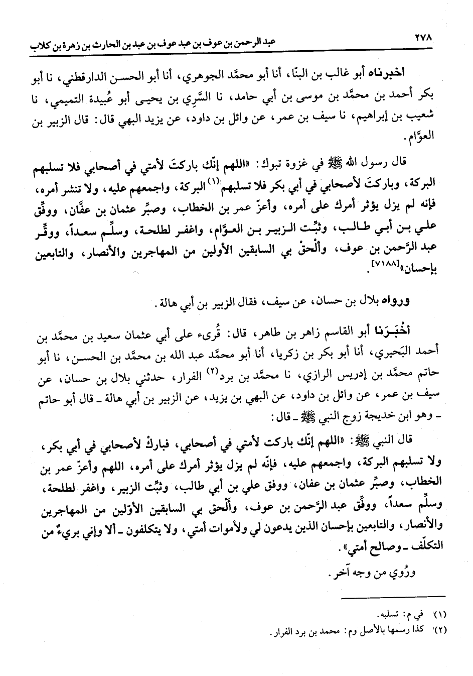 أخبرناه أبو غالب بن البنا انا أبو محمد الجوهري انا أبو الحسن الدارقطني نا أبو بكر احمد بن محمد بن موسى بن أبي حامد نا السري بن يحيى أبو عبيدة التميمي نا شعيب بن ابراهيم نا سيف بن عمر عن وائل بن داود عن يزيد البهي قال قال الزبير بن العوام قال رسول الله (صلى الله عليه وسلم) في غزوة تبوك اللهم انك باركت لأمتي في أصحابي فلا تسلبهم البركة وباركت لأصحابي في أبي بكر فلا تسلبهم (1) البركة واجمعهم عليه ولا تنشر امره فانه لم يزل يؤثر أمرك على أمره وأعز عمر بن الخطاب وصبر عثمان بن عفان ووفق علي بن ابي طالب وثبت الزبير بن العوام واغفر لطلحة وسلم سعدا ووقر عبد الرحمن بن عوف وألحق بي السابقين الأولين من المهاجرين والأنصار والتابعين بإحسان
