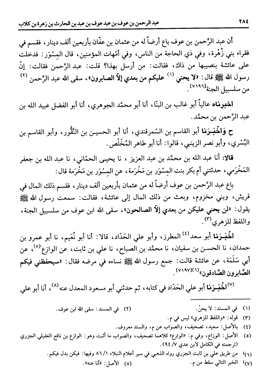 [7196] اخبرناه عاليا أبو غالب بن البنا انا أبو محمد الجوهري انا أبو الفضل عبيد الله بن عبد الرحمن بن محمد ح واخبرنا أبو القاسم بن السمرقندي انا أبو الحسين بن النقور وأبو القاسم بن البسري وابو نصر الزينبي قالوا انا أبو طاهر المخلص قالا انا عبد الله بن محمد بن عبد العزيز نا يحيى الحماني نا عبد الله بن جعفر المخرمي حدثتني ام بكر بنت المسور بن مخرمة عن المسور بن مخرمة قال باع عبد الرحمن بن عوف ارضا له من عثمان بأربعين الف دينار فقسم ذلك المال في قريش وبني مخزوم وبعث من ذلك المال الى عائشة فقالت سمعت رسول الله (صلى الله عليه وسلم) يقول لن يحني عليكن من بعدي الا الصالحون سقى الله ابن عوف من سلسبيل الجنة واللفظ للزهري (3) اخبرنا أبو سعد (4) المطرز وابو علي الحداد قالا انا أبو نعيم نا أبو عمرو بن حمدان نا الحسن بن سفيان نا محمد بن الصباح نا علي بن ثابت عن الوازع (5) عن أبي سلمة عن عائشة قالت جمع رسول الله (صلى الله عليه وسلم) نساءه في مرضه فقال سيحفظني فيكم الصابرون الصادقون (6)