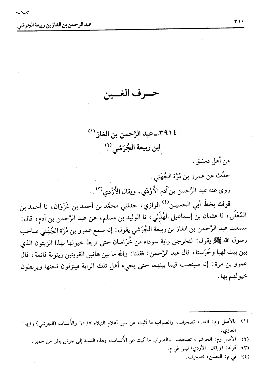 3914 - عبد الرحمن بن الغاز (1) ابن ربيعة الجرشي (2) من أهل دمشق حدث عن عمرو بن مرة الجهني حدث عنه عبد الرحمن بن آدم الأودي ويقال الأزدي (3) قرأت بخط أبي الحسين (4) الرازي حدثني محمد بن احمد بن غزوان نا احمد بن المعلى نا عثمان بن اسماعيل الهذلي نا الوليد بن مسلم عن عبد الرحمن بن آدم قال سمعت عبد الرحمن بن الغاز بن ربيعة الجرشي يقول انه سمع عمرو بن مرة الجهني صاحب رسول الله (صلى الله عليه وسلم) يقول لتخرجن راية سوداء من خراسان حتى تربط خيولها بهذا الزيتون الذي بين بيت لهيا وحرستا قال عبد الرحمن فقلنا والله ما بين هاتين القريتين زيتونة قائمة قال عمرو بن مرة انه سينصب فيما بينهما حتى يجئ اهل تلك الراية فينزلون تحتها ويربطون خيولهم بها