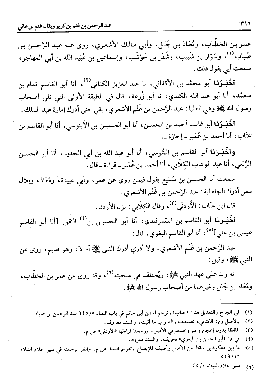 عمر بن الخطاب ومعاذ بن جبل وأبي مالك الأشعري روى عنه عبد الرحمن بن صباب (1) وسوار بن شبيب وشهر بن حوشب واسماعيل بن عبيد الله بن ابي المهاجر سمعت أبي يقول ذلك أخبرنا أبو محمد بن الأكفاني نا عبد العزيز الكتاني (2) انا أبو القاسم تمام بن محمد انا أبو عبد الله الكندي نا أبو زرعة قال في الطبقة الأولى التى تلي أصحاب رسول الله (صلى الله عليه وسلم) وهي العليا عبد الرحمن بن غنم الأشعري بقي حتى أدرك امارة عبد الملك أخبرنا أبو غالب احمد بن الحسن انا أبو الحسين بن الآبنوسي انا أبو القاسم بن عتاب انا أحمد بن عمير اجازة وأخبرنا أبو القاسم بن السوسي انا أبو عبد الله بن أبي الحديد أنا أبو الحسن الربعي انا عبد الوهاب الكلابي انا احمد بن عمير قراءة قال سمعت أبا الحسن بن سميع يقول فيمن روى عن عمر وأبي عبيدة ومعاذ وبلال ممن أدرك الجاهلية عبد الرحمن بن غنم الأشعري قال ابن عتاب: الاردني (3) وقال الكلابي نزل الأردن أخبرنا أبو القاسم بن السمرقندي انا أبو الحسين (4) بن النقور [انا أبو القاسم عيسى بن علي] (5) انا أبو القاسم البغوي قال عبد الرحمن بن غنم الأشعري ولا أدري ادرك النبي (صلى الله عليه وسلم) ام لا وهو قديم روى عن النبي (صلى الله عليه وسلم) وقيل انه ولد على عهد النبي (صلى الله عليه وسلم) ويختلف في صحبته (6) وقد روى عن عمر بن الخطاب ومعاذ بن جبل وغيرهما من أصحاب رسول الله (صلى الله عليه وسلم)