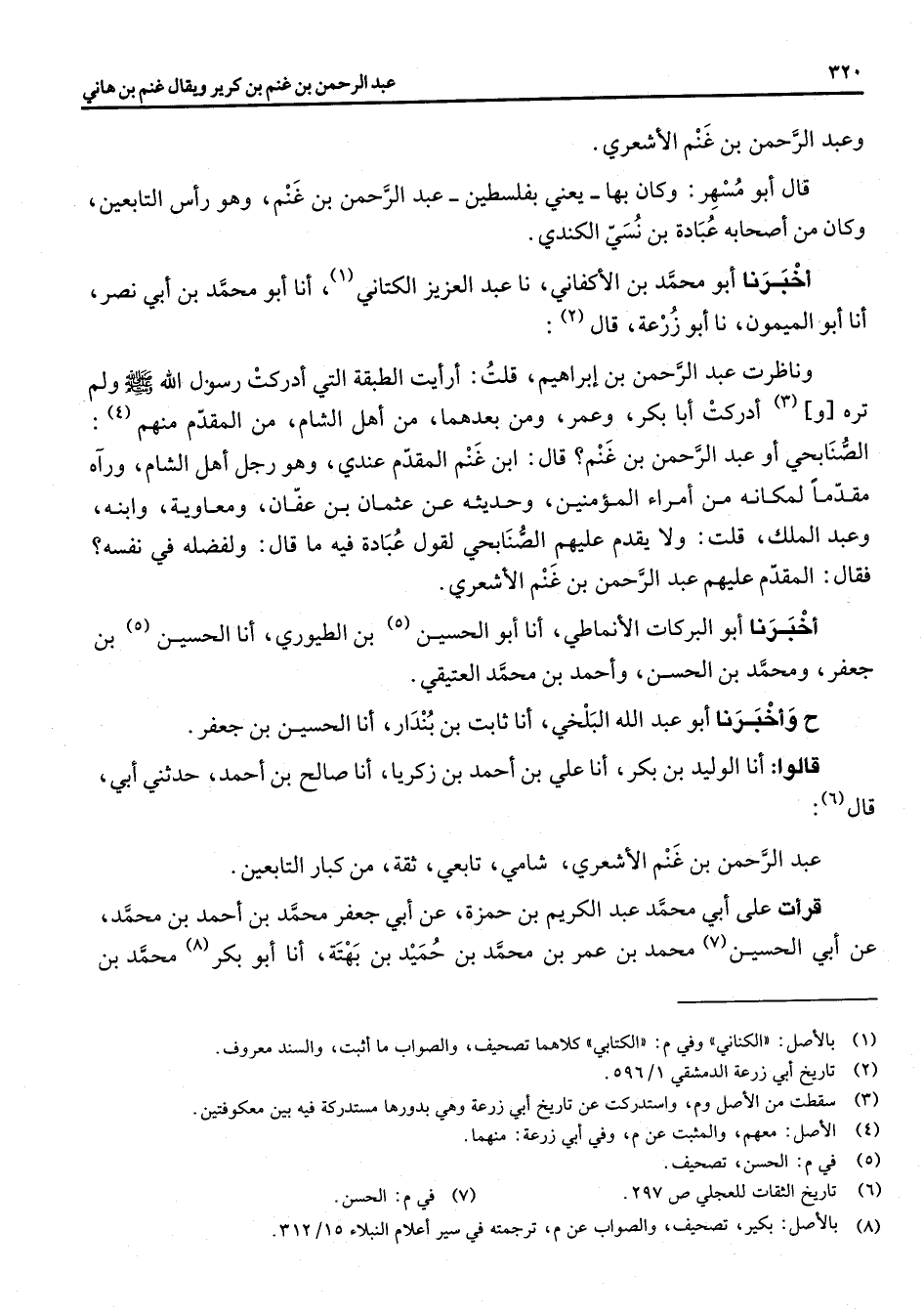 وعبد الرحمن بن غنم الأشعري قال أبو مسهر وكان بها يعني بفلسطين عبد الرحمن بن غنم وهو رأس التابعين وكان من اصحابه عبادة بن نسي الكندي أخبرنا أبو محمد بن الأكفاني نا عبد العزيز الكتاني (1) انا أبو محمد بن أبي نصر انا أبو الميمون نا أبو زرعة قال (2) وناظرت عبد الرحمن بن ابراهيم قلت أرأيت الطبقة التى أدركت رسول الله (صلى الله عليه وسلم) ولم تره [و] (3) أدركت أبا بكر وعمر ومن بعدهما من اهل الشام من المقدم منهم (4) الصنابحي أو عبد الرحمن بن غنم قال ابن غنم المقدم عندي وهو رجل اهل الشام ورآه مقدما لمكانه من امراء المؤمنين وحديثه عن عثمان بن عفان ومعاوية وابنه وعبد الملك قلت ولا يقدم عليهم الصنابحي لقول عبادة فيه ما قال ولفضله في نفسه فقال المقدم عليهم عبد الرحمن بن غنم الأشعري اخبرنا أبو البركات الأنماطي انا أبو الحسين بن (5) الطيوري انا الحسين (5) بن جعفر ومحمد بن الحسن واحمد بن محمد العتيقي ح واخبرنا أبو عبد الله البلخي انا ثابت بن بندار انا الحسين بن جعفر قالوا انا الوليد بن بكر انا علي بن احمد بن زكريا انا صالح بن احمد حدثني أبي قال (6) عبد الرحمن بن غنم الأشعري شامي تابعي ثقة من كبار التابعين قرأت على ابي محمد عبد الكريم بن حمزة عن ابي جعفر محمد بن احمد بن محمد عن ابي الحسين (7) محمد بن عمر بن محمد بن حميد بن بهتة انا أبو بكر (8) محمد بن