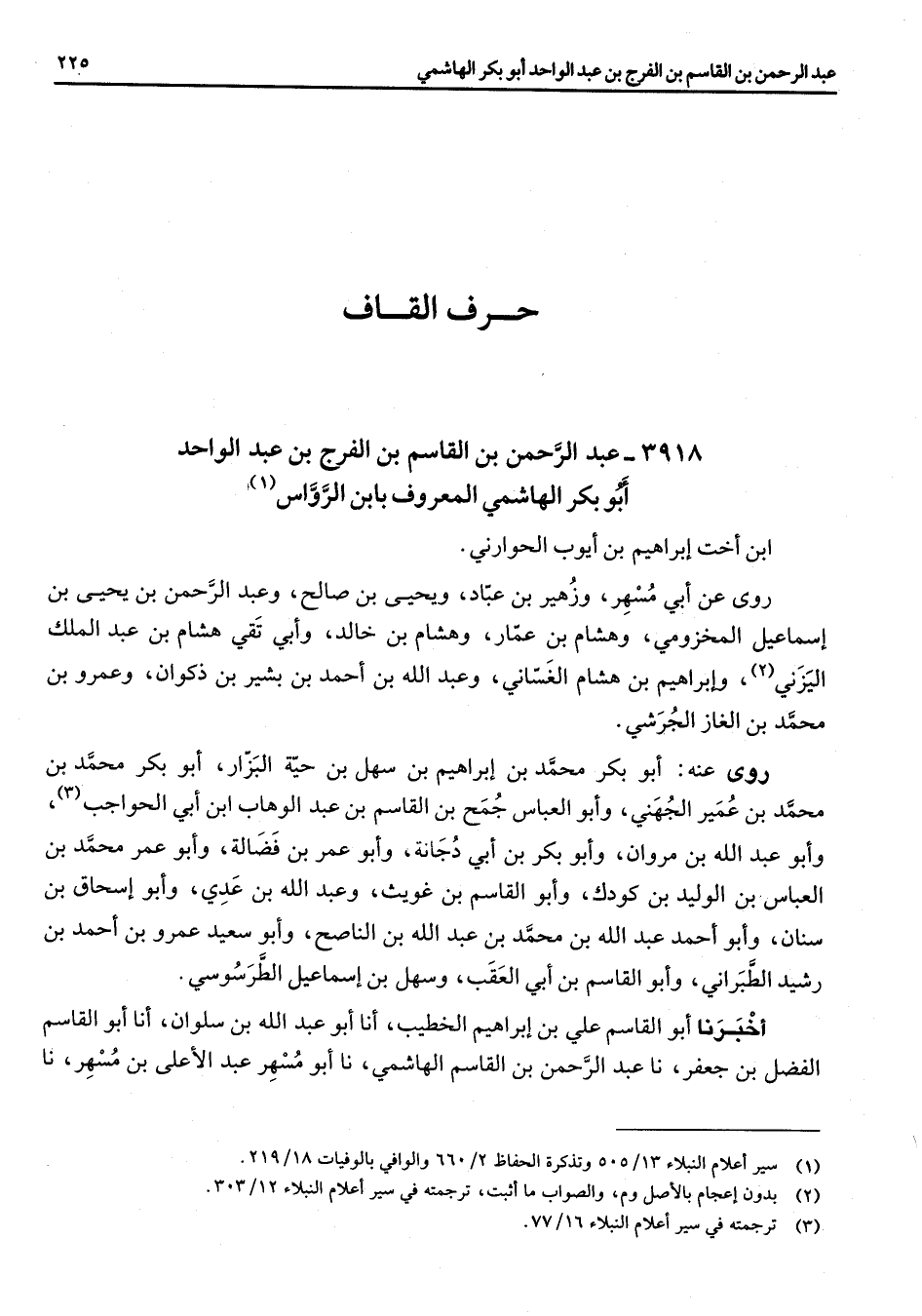 3918 - عبد الرحمن بن القاسسم بن الفرج بن عبد الواحد أبو بكر الهاشمي المعروف بابن الرواس (1) ابن اخت ابراهيم بن أيوب الحوراني روى عن ابي مسهر وزهير بن عباد ويحيى بن صالح وعبد الرحمن بن يحيى بن اسماعيل المخزومي وهشام بن عمار وهشام بن خالد وأبي تقي هشام بن عبد الملك اليزني (2) وابراهيم بن هشام الغساني وعبد الله بن احمد بن بشير بن ذكوان وعمرو بن محمد بن الغاز الجرشي روى عنه أبو بكر محمد بن ابراهيم بن سهل بن حية البزار أبو بكر محمد بن محمد بن عمير الجهني وابو العباس جمح بن القاسم بن عبد الوهاب ابن أبي الحواجب (3) وابو عبد الله بن مروان وأبو بكر بن ابي دجانة وأبو عمر بن فضالة وأبو عمر محمد بن العباس بن الوليد بن كودك وأبو القاسم بن غويث وعبد الله بن عدي وابو اسحاق بن سنان وأبو احمد عبد الله بن محمد بن عبد الله بن الناصح وأبو سعيد عمرو بن احمد بن رشيد الطبراني وابو القاسم بن ابي العقب وسهل بن اسماعيل الطرسوسي أخبرنا أبو القاسم علي بن ابراهيم الخطيب انا أبو عبد الله بن سلوان انا أبو القاسم الفضل بن جعفر نا عبد الرحمن بن القاسم الهاشمي نا أبو مسهر عبد الأعلى بن مسهر نا