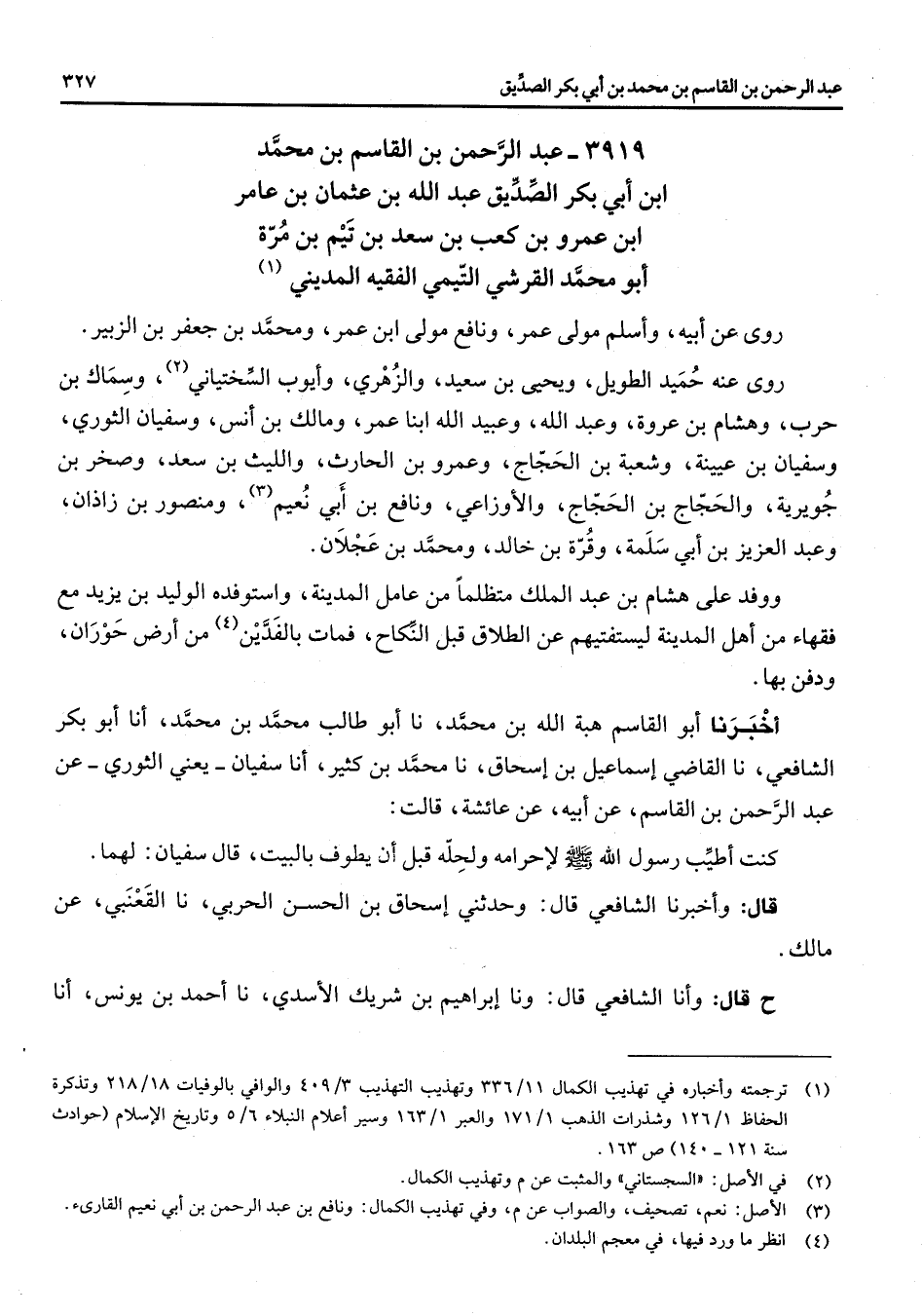 3919 - عبد الرحمن بن القاسم بن محمد ابن ابي بكر الصديق عبد الله بن عثمان بن عامر ابن عمرو بن كعب بن سعد بن تيم بن مرة أبو محمد القرشي التيمي الفقيه المديني (1) روى عن أبيه وأسلم مولى عمر ونافع مولى ابن عمر ومحمد بن جعفر بن الزبير روى عنه حميد الطويل ويحيى بن سعيد والزهري وأيوب السختياني (2) وسماك بن حرب وهشام بن عروة وعبد الله وعبيد الله ابنا عمر ومالك ابن انس وسفيان الثوري وسفيان بن عيينة وشعبة بن الحجاج وعمرو بن الحارث والليث بن سعد وصخر بن جويرية والحجاج بن الحجاج والأوزاعي ونافع بن ابي نعيم (3) ومنصور بن زاذان وعبد العزيز بن أبي سلمة وقرة بن خالد ومحمد بن عجلان ووفد على هشام بن عبد الملك متظلما من عامل المدينة واستوفده الوليد بن يزيد مع فقهاء من اهل المدينة ليستفتيهم عن الطلاق قبل النكاح فمات بالفدين (4) من أرض حوران ودفن بها اخبرنا أبو القاسم هبة الله بن محمد نا أبو طالب محمد بن محمد انا أبو بكر الشافعي نا القاضي اسماعيل بن اسحاق نا محمد بن كثير انا سفيان يعني الثوري عن عبد الرحمن بن القاسم عن أبيه عن عائشة قالت كنت اطيب رسول الله (صلى الله عليه وسلم) لاحرامه ولحله قبل ان يطوف بالبيت قال سفيان لهما قال واخبرنا الشافعي قال وحدثني اسحاق بن الحسن الحربي نا القعنبي عن مالك ح قال وأنا الشافعي قال ونا ابراهيم بن شريك الأسدي نا احمد بن يونس أنا